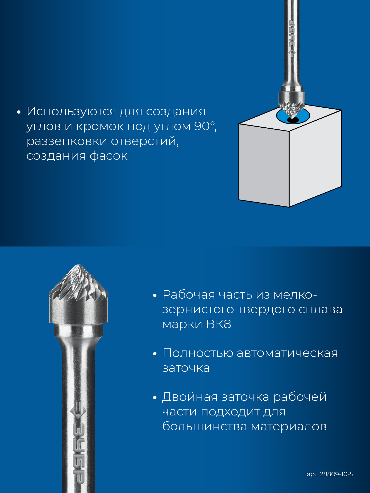 ЗУБР 10х5 мм, тип K (зенкер с вершиной 90°), хв-к 6 мм, твердосплавная борфреза, ПРОФЕССИОНАЛ (28809-10-5)