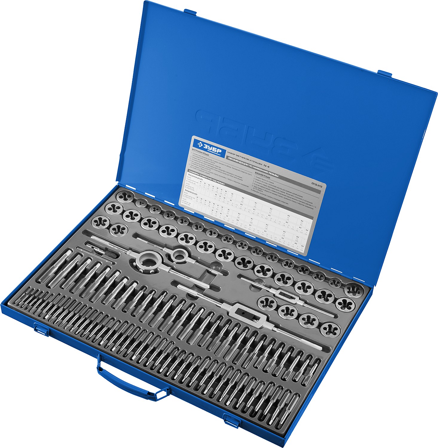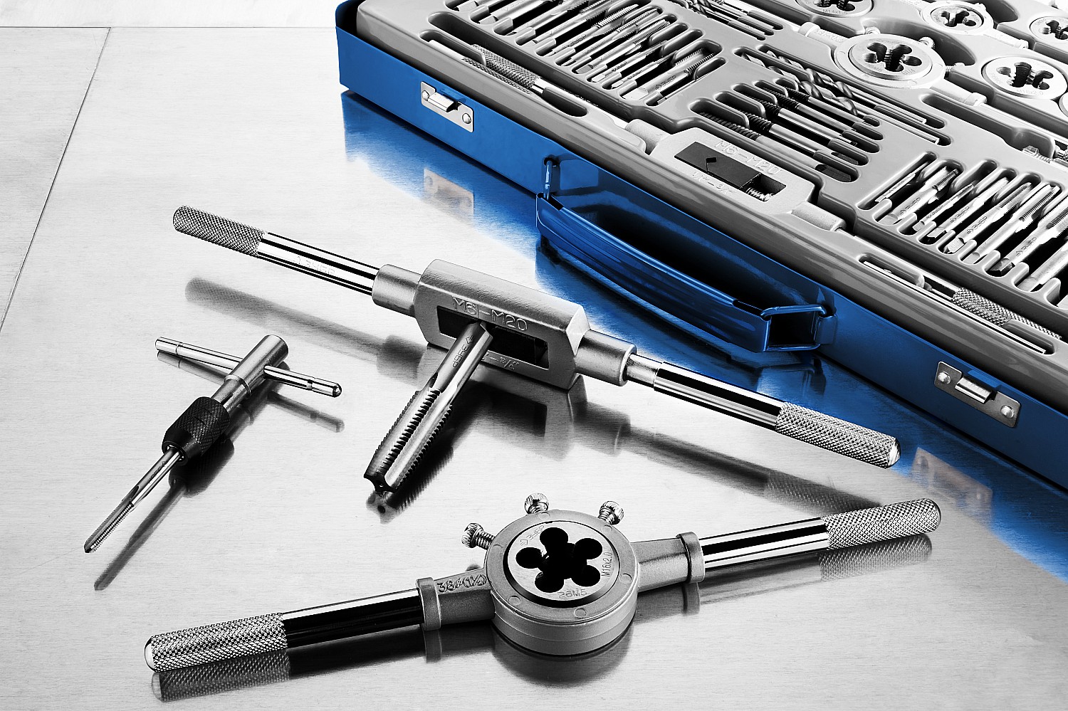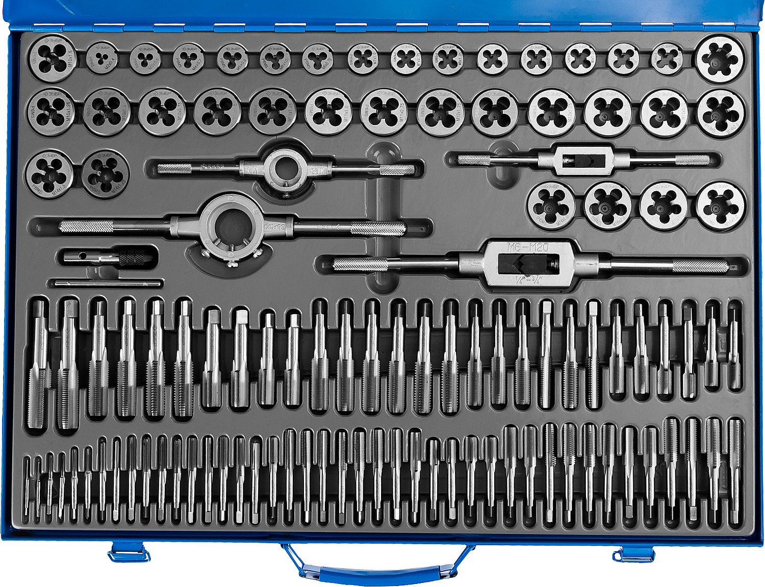 Набор предназначен для нарезания и калибрования внутренней и внешней метрической и трубной резьбы в сквозных и глухих отверстиях в сталях с пределом прочности до 900Н/мм2, цветных металлах, пластике.