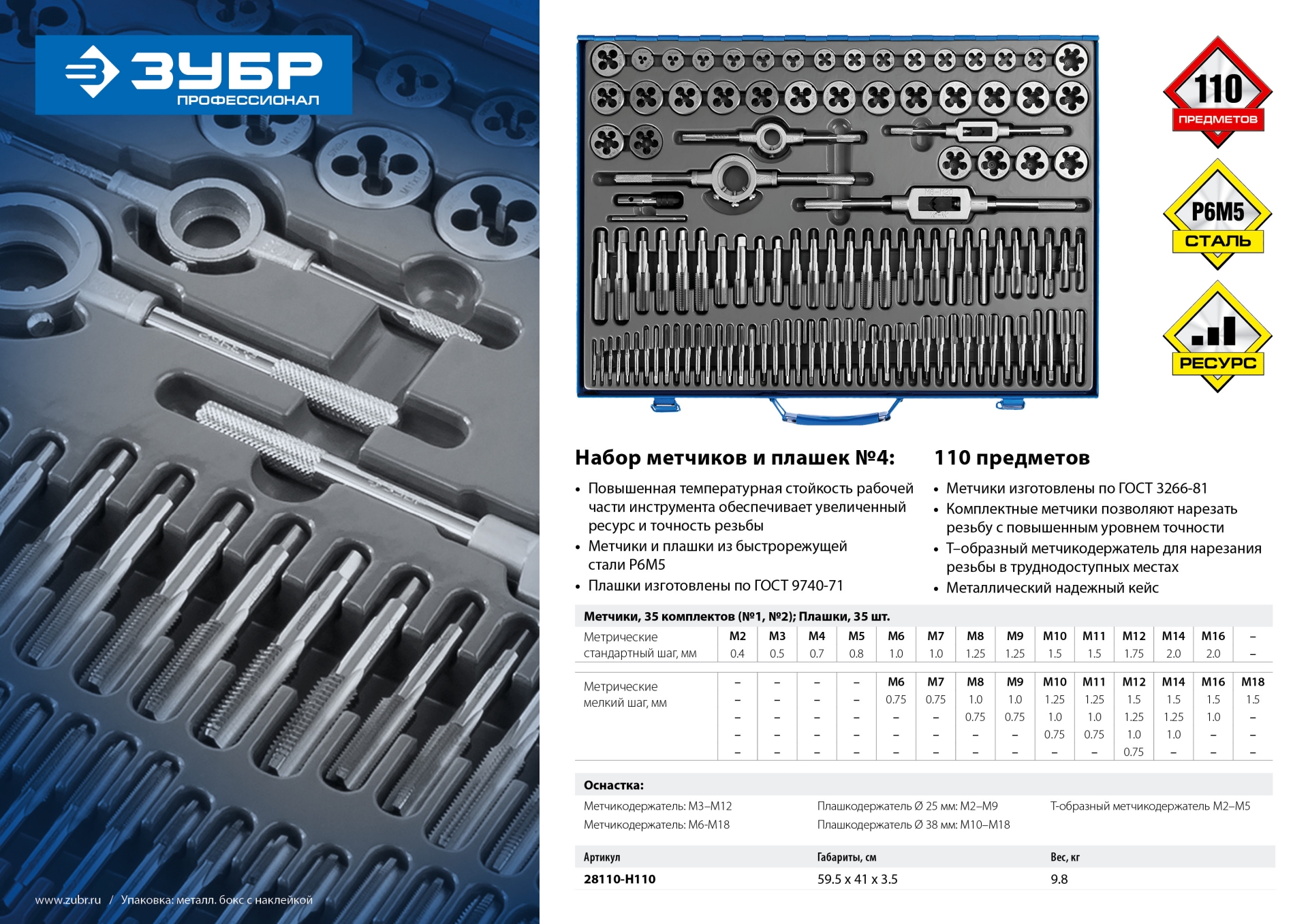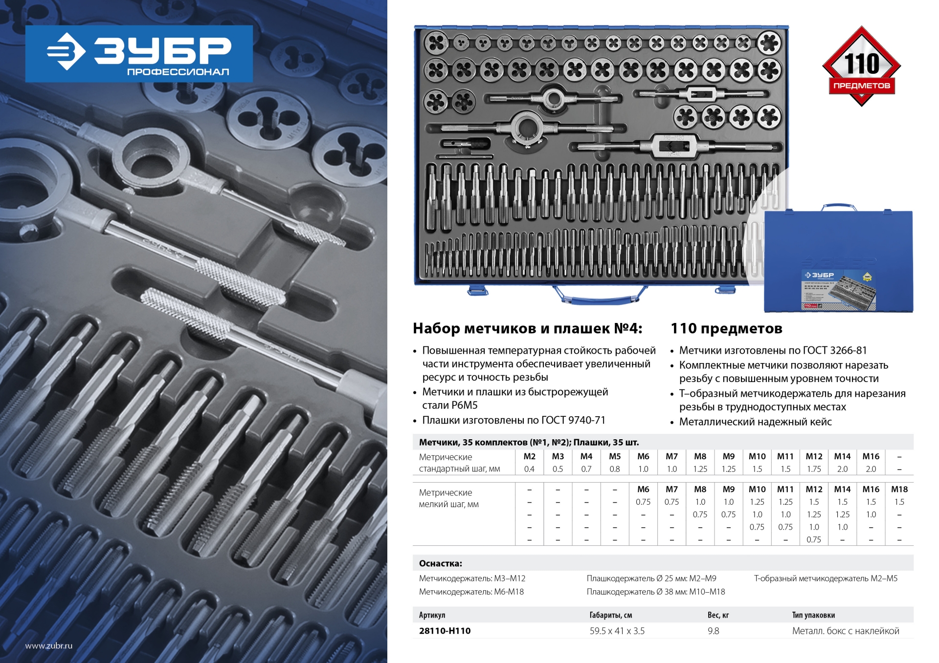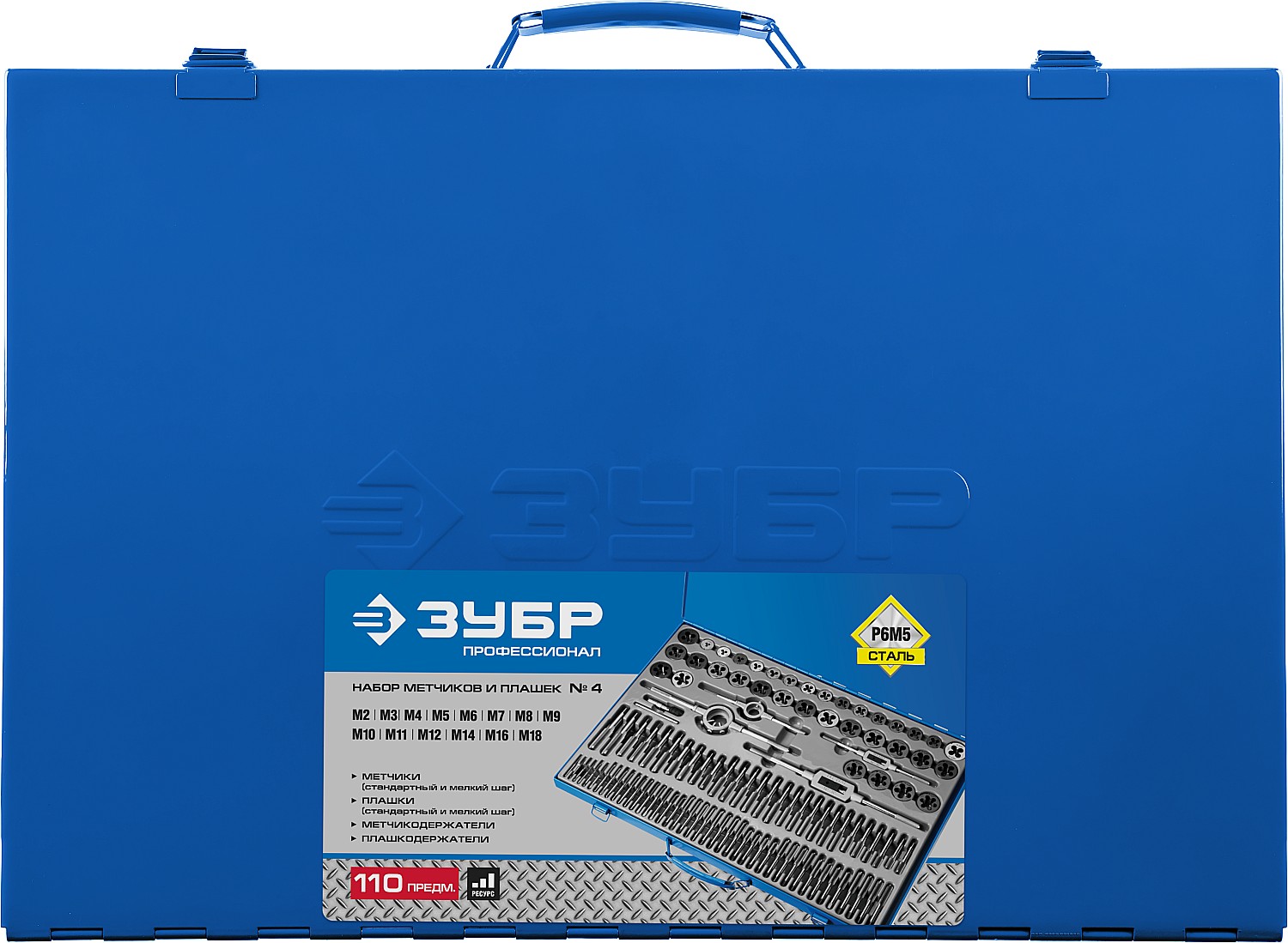 Набор предназначен для нарезания и калибрования внутренней и внешней метрической и трубной резьбы в сквозных и глухих отверстиях в сталях с пределом прочности до 900Н/мм2, цветных металлах, пластике.