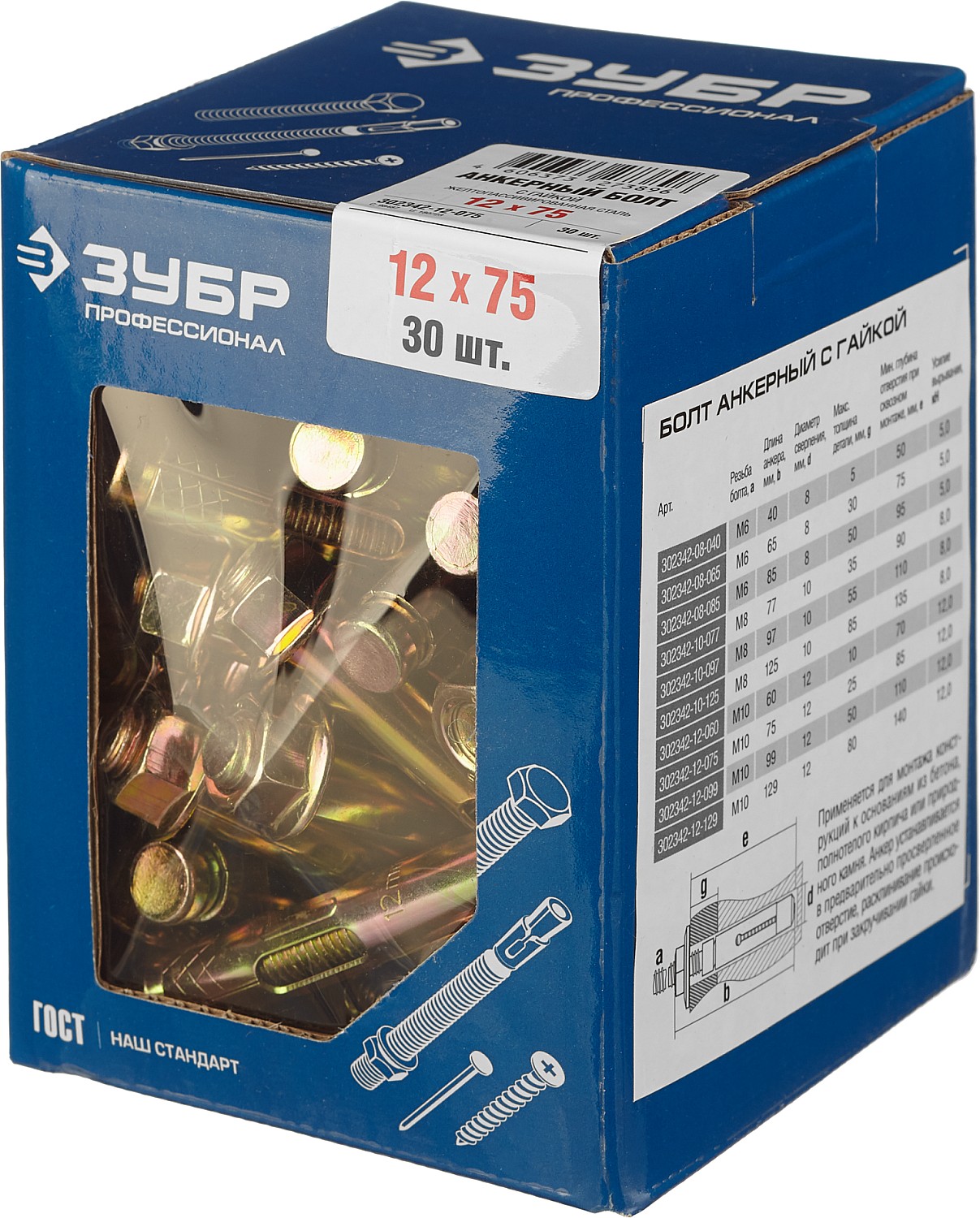 ЗУБР 12 х 75 мм, 30 шт, анкерный болт с гайкой, Профессионал (302342-12-075)
