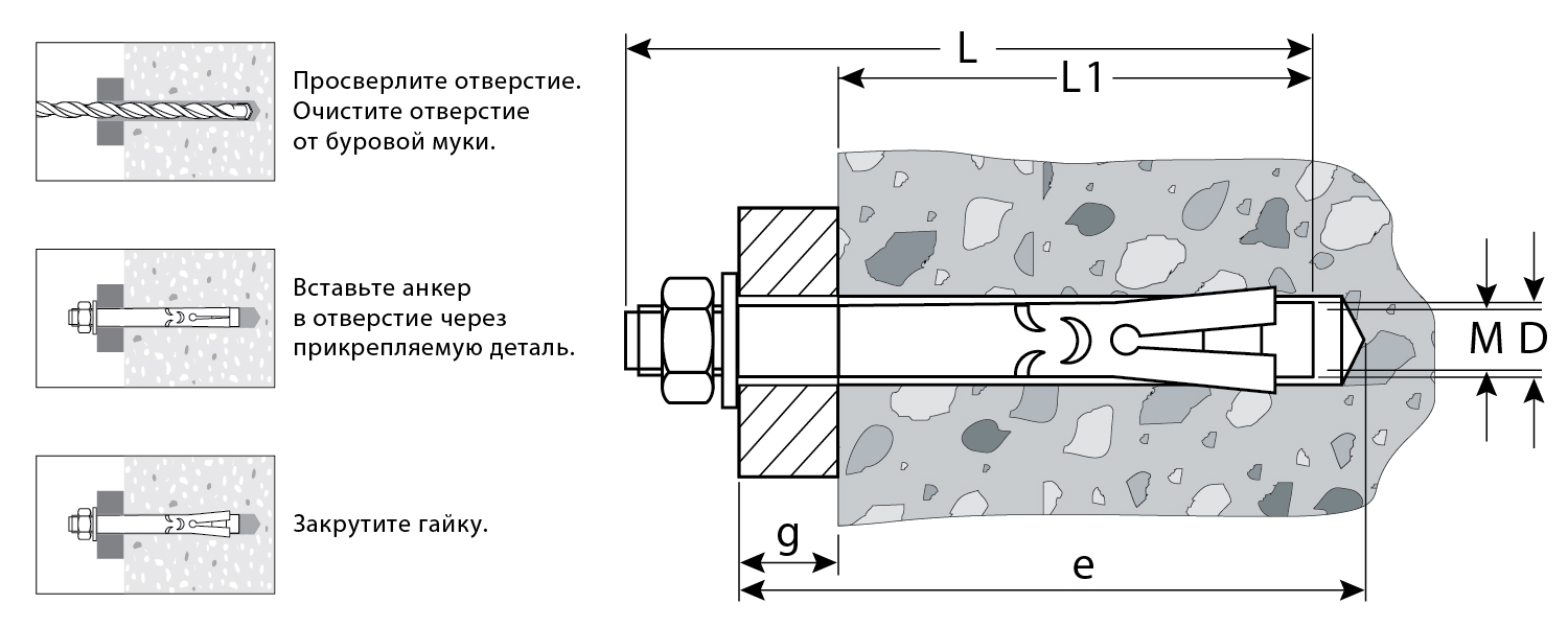 Для монтажа конструкций к полнотелым основаниям: поверхностям из бетона, полнотелого кирпича или природного камня. Анкер устанавливается в предварительно просверленное и очищенное от буровой муки отверстие и расклинивается при закручивании гайки