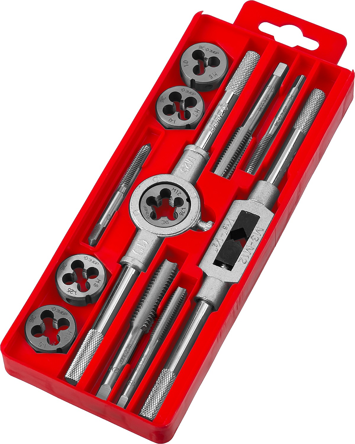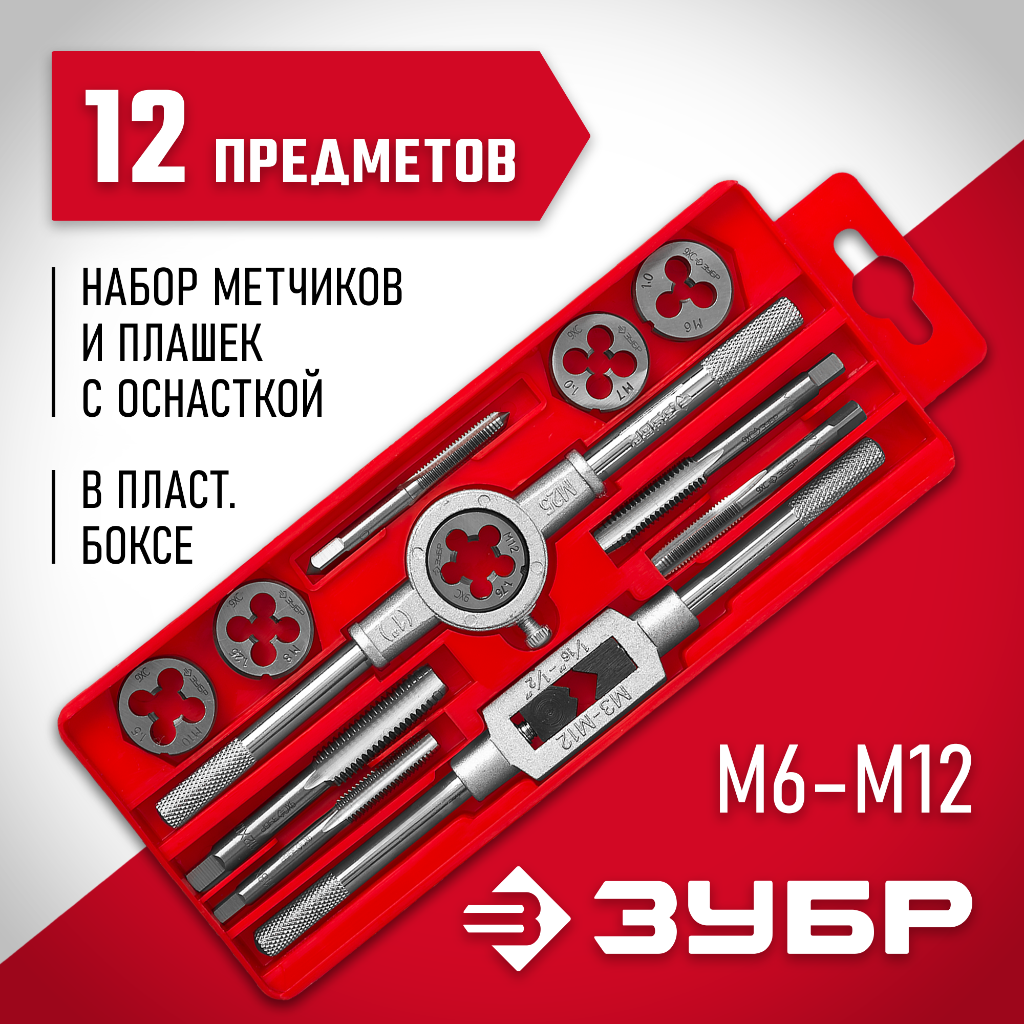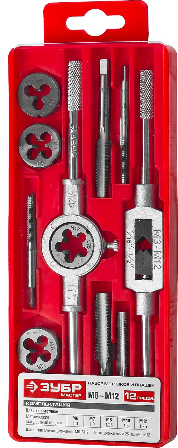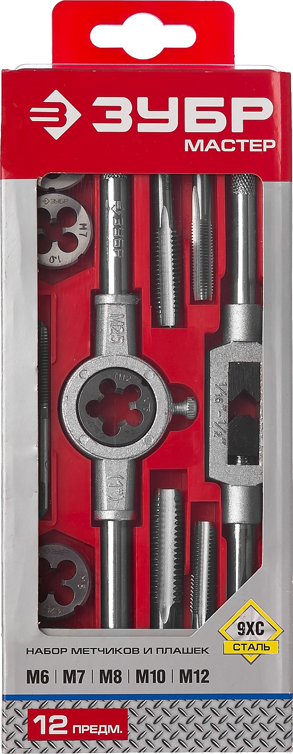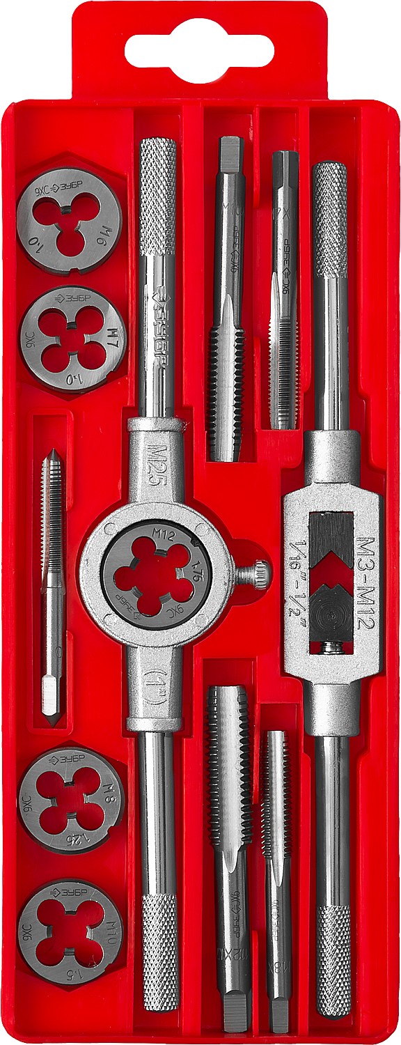 ЗУБР 12 предм., сталь 9ХС, набор метчиков и плашек в пластиковом боксе (28121-H12)