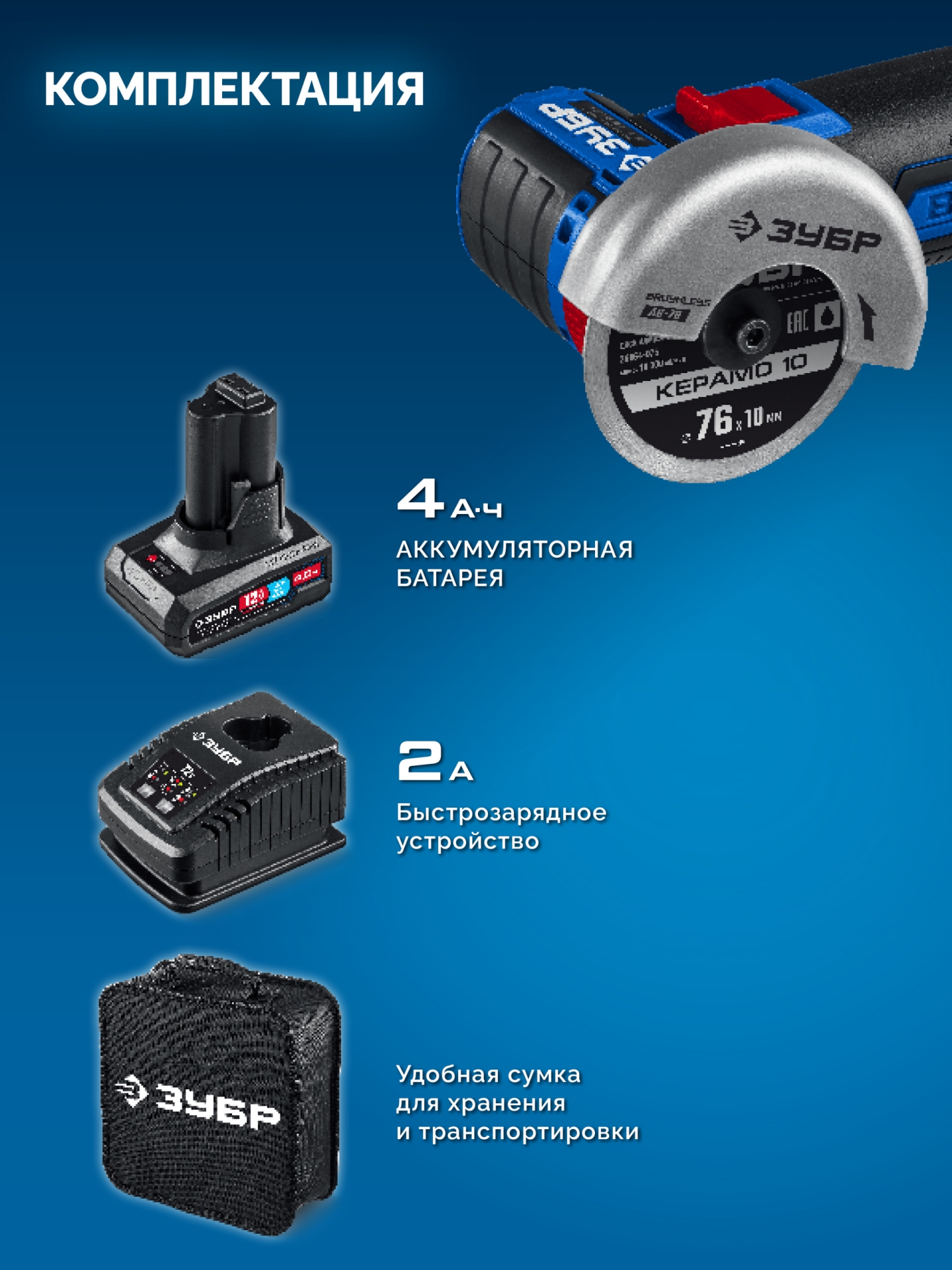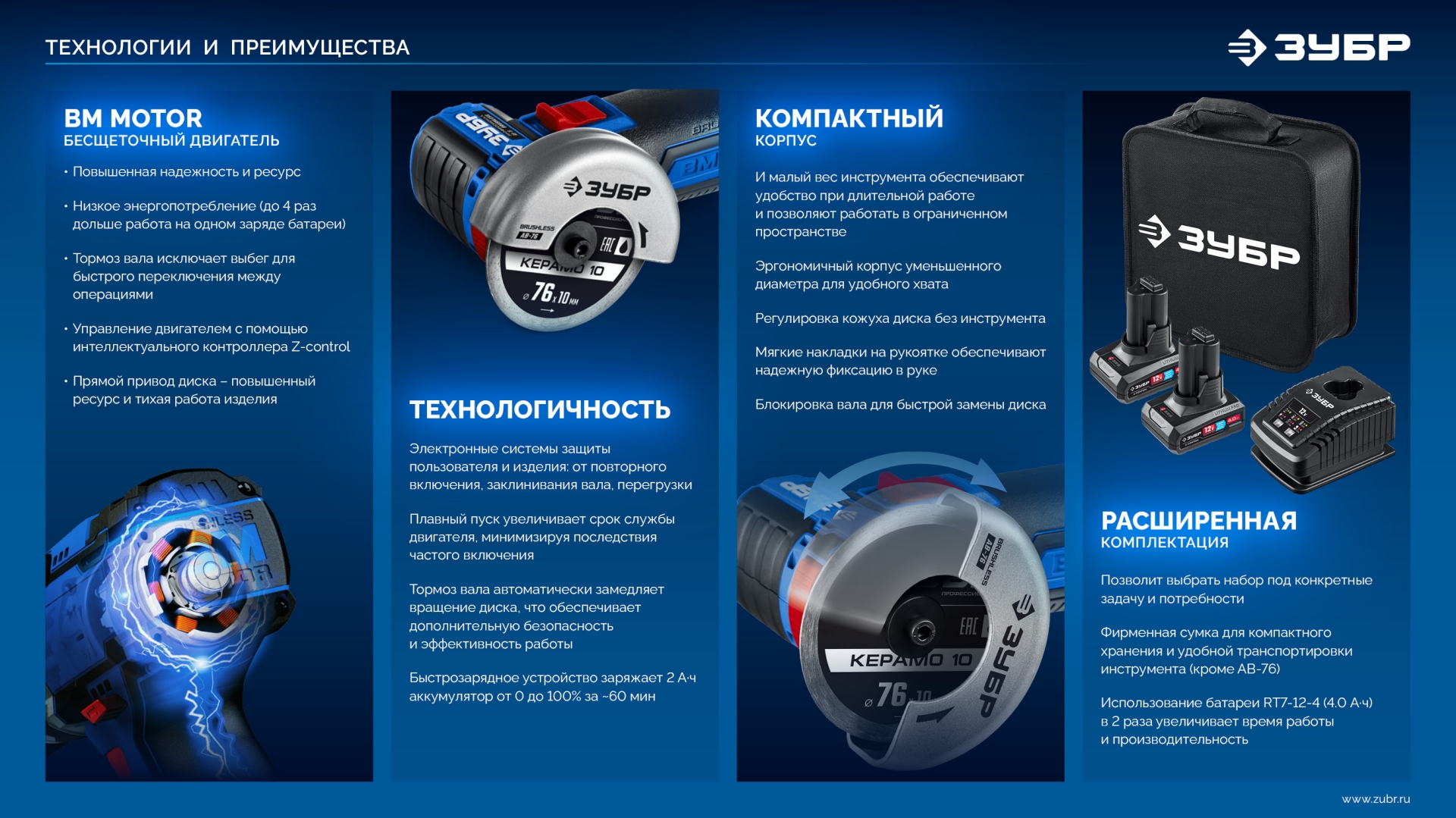 - отсутствие потери мощности в процессе работы - Батарея емкостью 4.0 Ач в комплекте для безостановочной работы