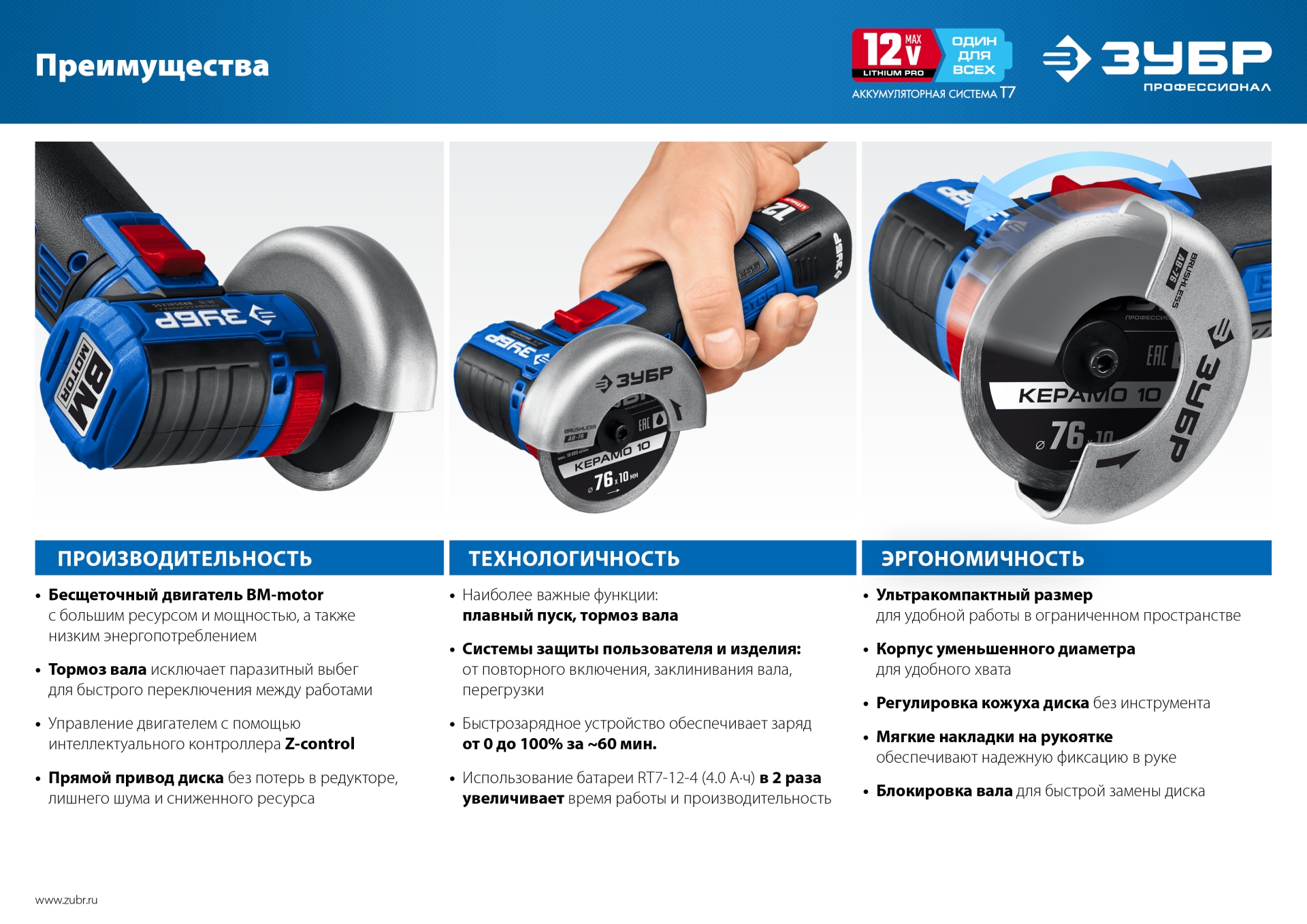 - высокий КПД благодаря максимально эффективному преобразованию электромагнитной энергии в механическую (ввиду отсутствия перекоммутаций), - - низкое энергопотребление, вследствие чего изделие работает до 4 раз дольше на одном заряде батареи,