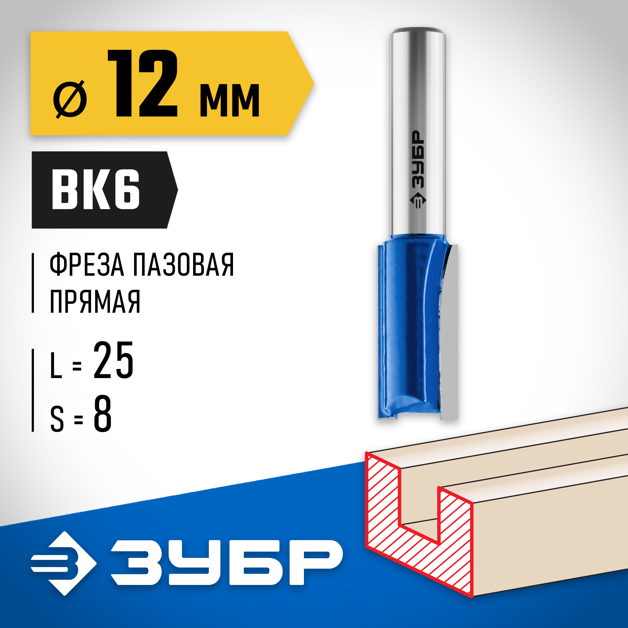 ЗУБР 12 x 25 мм, хвостовик 8 мм, фреза пазовая прямая, Профессионал (28753-12-25)
