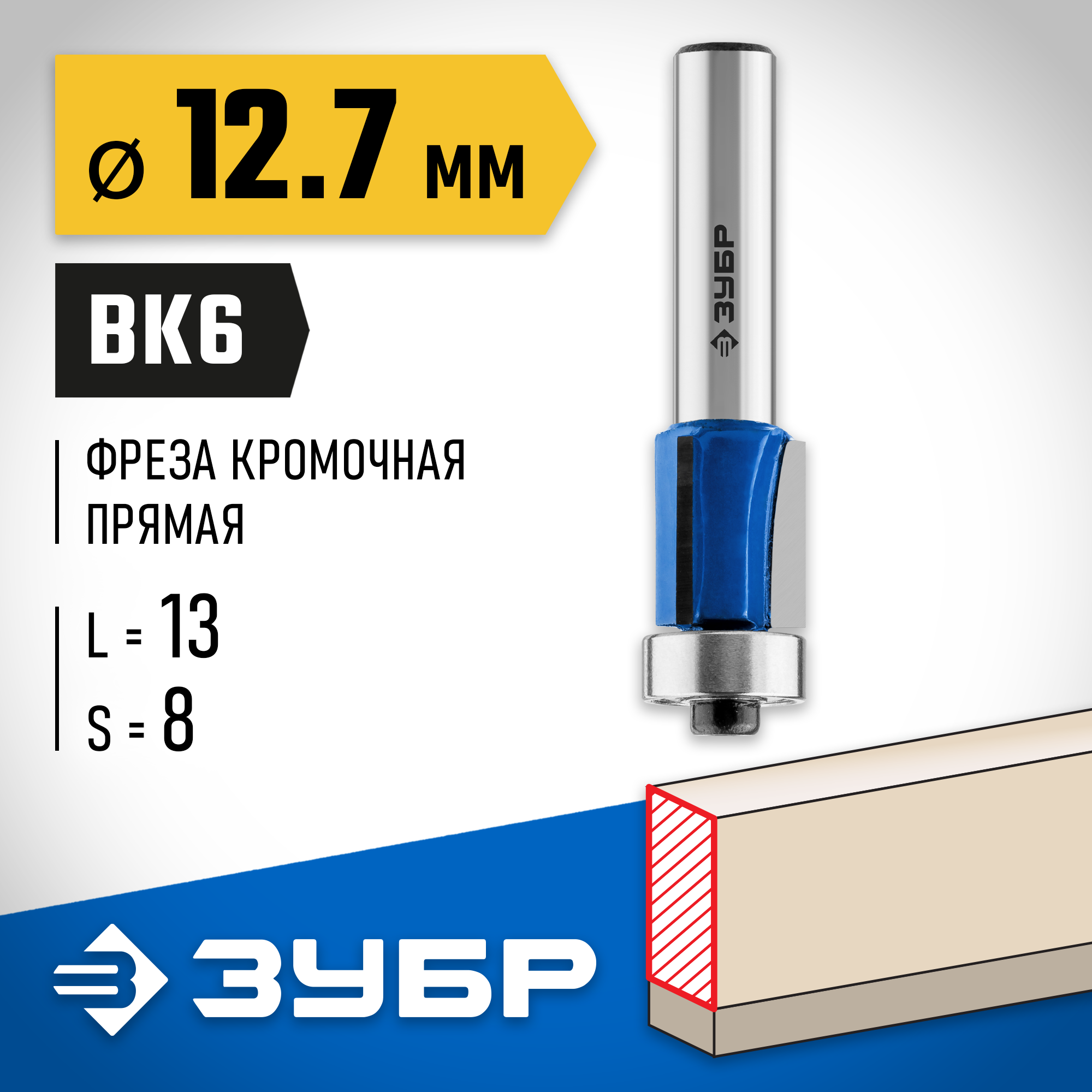 ЗУБР 12.7 x 13 мм, хвостовик 8 мм, фреза кромочная с нижним подшипником (3 лезвия), Профессионал (28728-12.7-13)