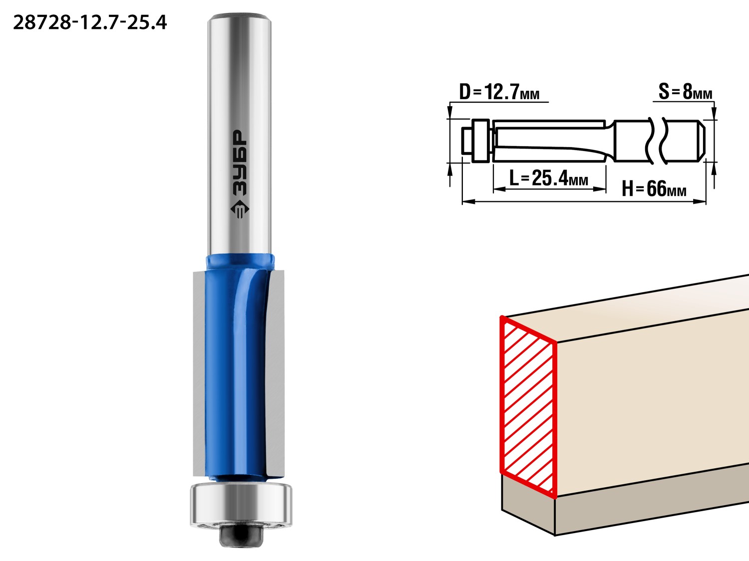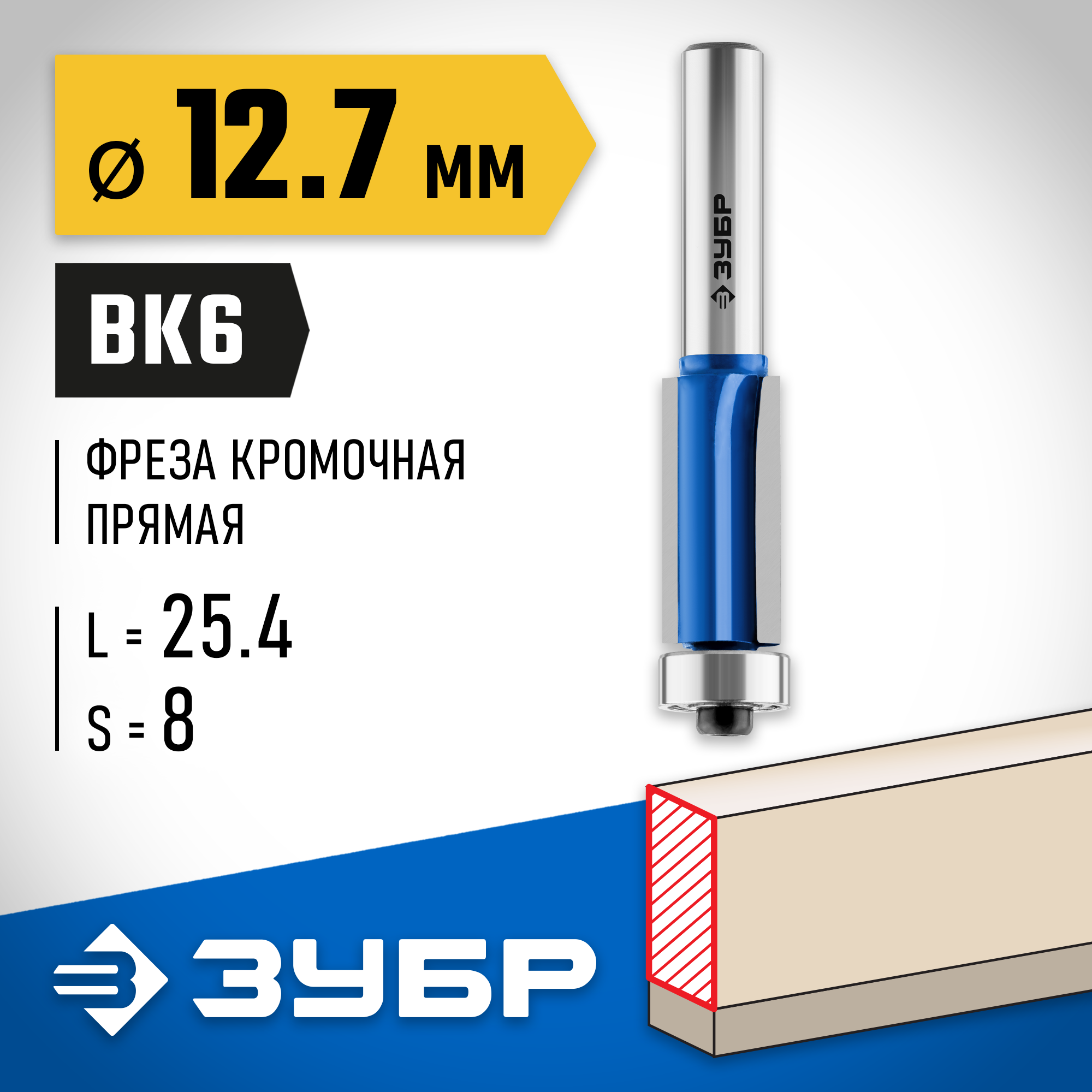ЗУБР 12.7 x 25.4 мм, хвостовик 8 мм, фреза кромочная с нижним подшипником (3 лезвия), Профессионал (28728-12.7-25.4)
