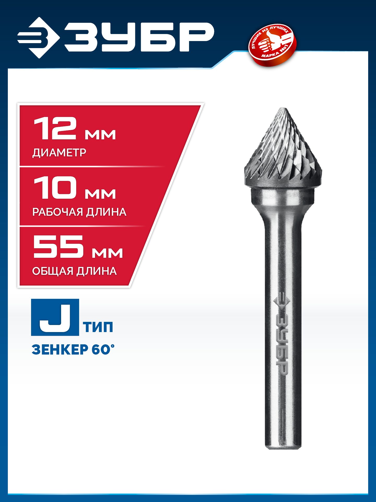 ЗУБР 12х10 мм, тип J (зенкер с вершиной 60°), хв-к 6 мм, твердосплавная борфреза, ПРОФЕССИОНАЛ (28808-12-10)