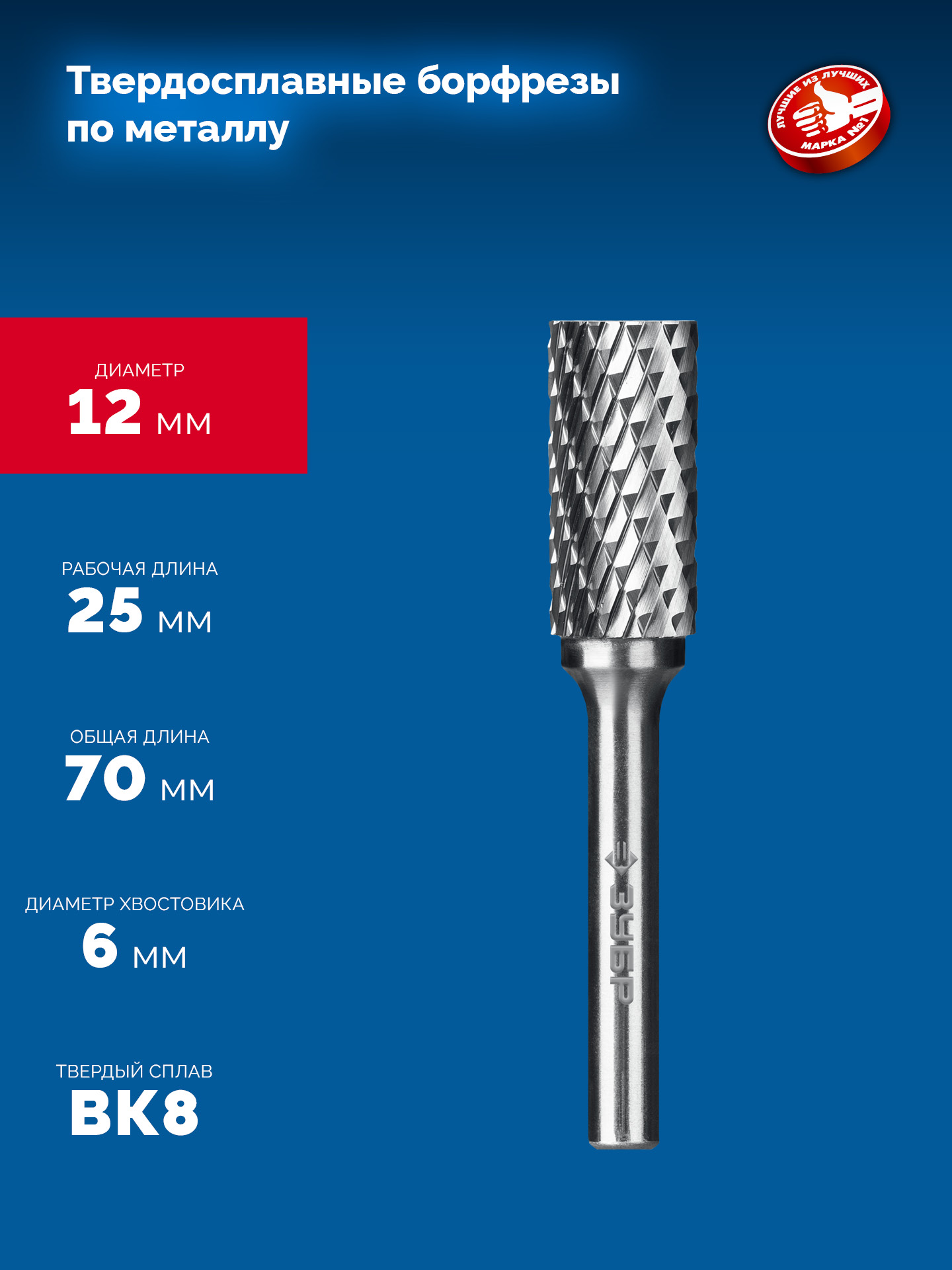 ЗУБР 12х25 мм, тип А (цилиндр с гладким торцом), хв-к 6 мм, твердосплавная борфреза, ПРОФЕССИОНАЛ (28800-12-25)