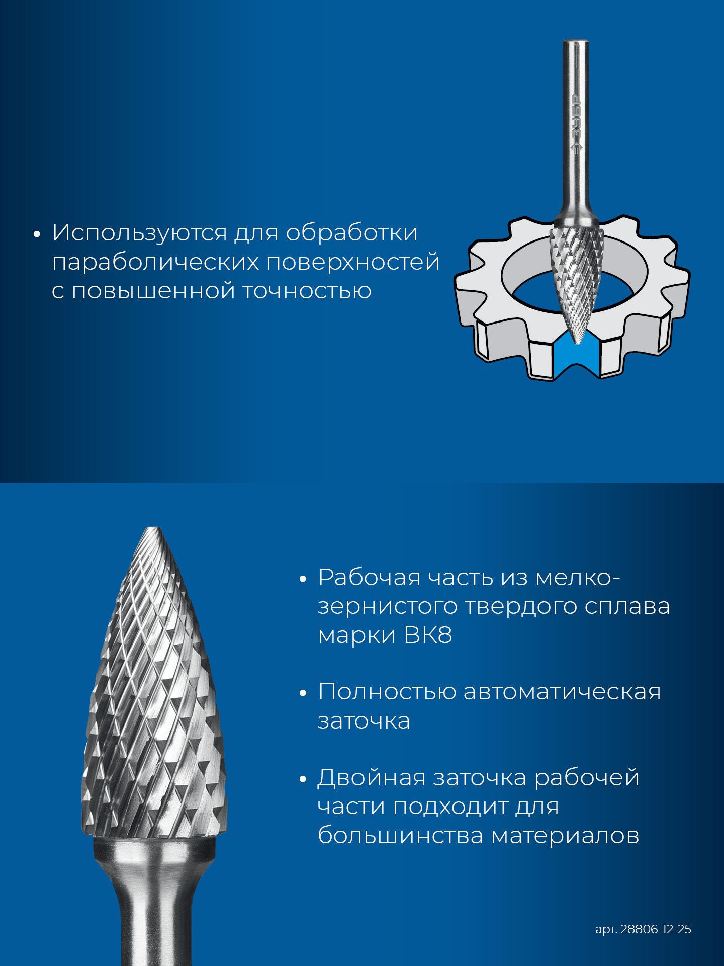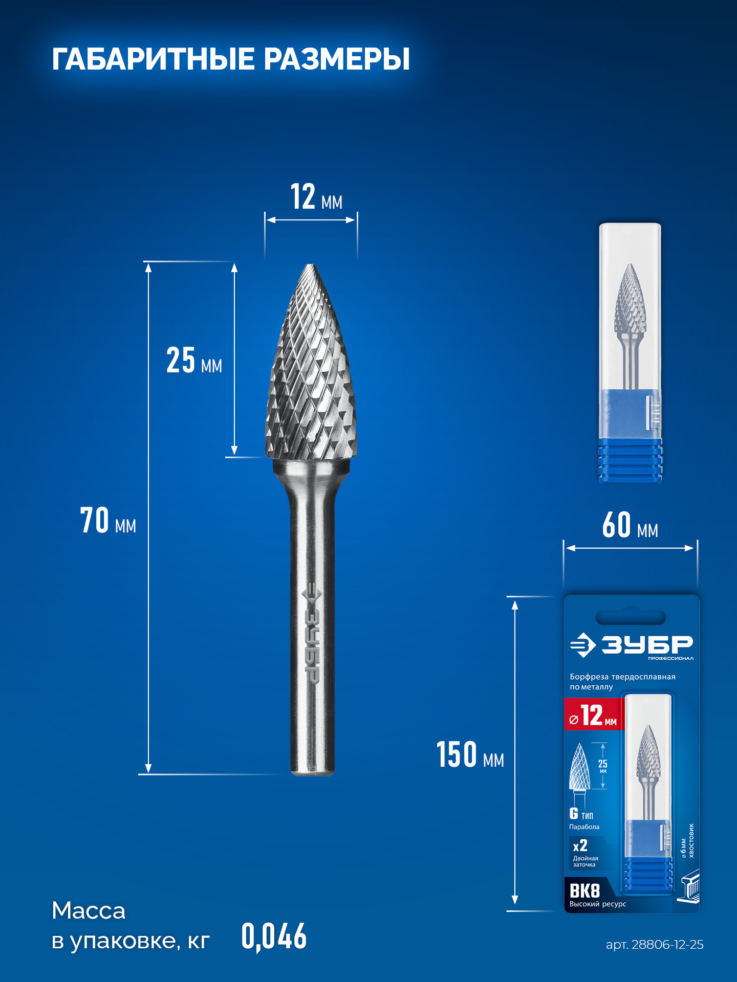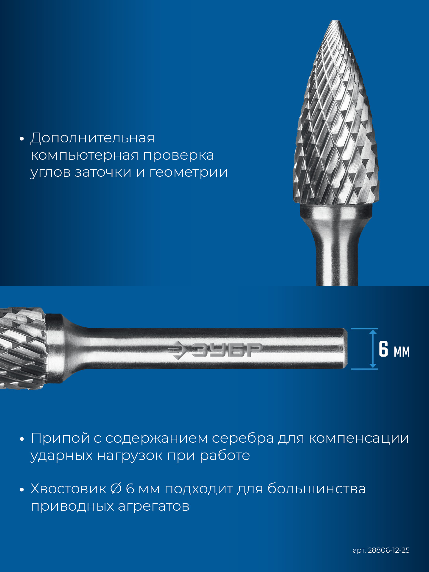 ЗУБР 12х25 мм, тип G (парабола с острым углом), хв-к 6 мм, твердосплавная борфреза, ПРОФЕССИОНАЛ (28806-12-25)
