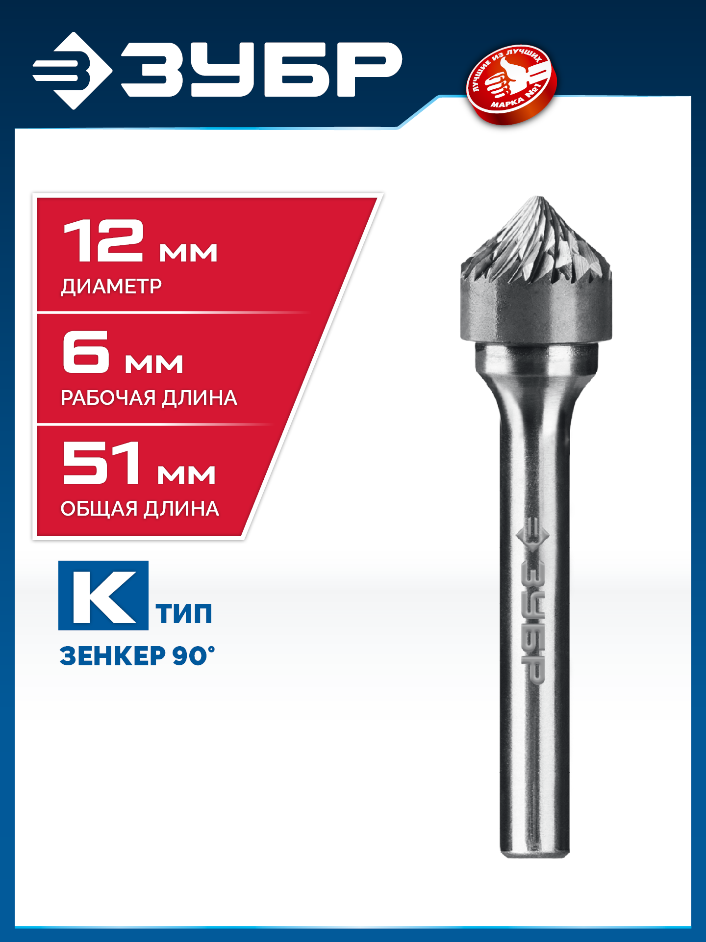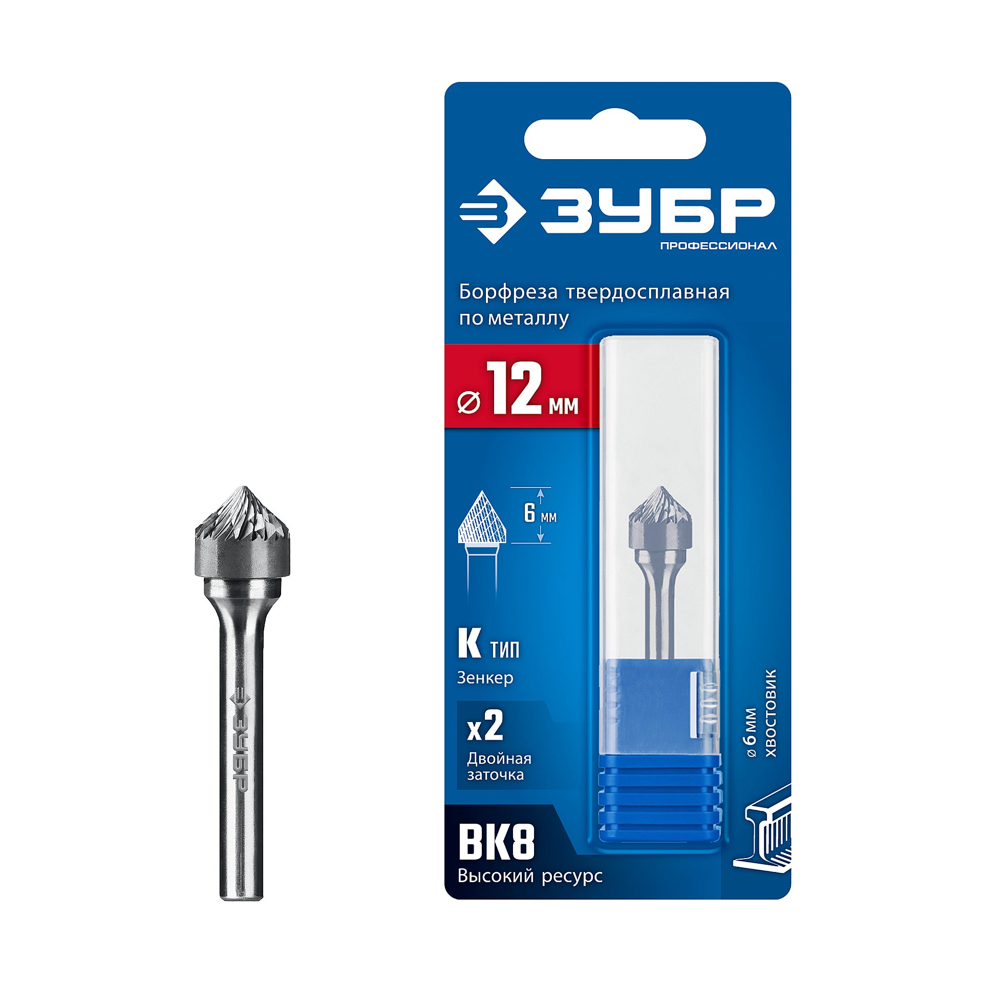 ЗУБР 12х6 мм, тип K (зенкер с вершиной 90°), хв-к 6 мм, твердосплавная борфреза, ПРОФЕССИОНАЛ (28809-12-6)