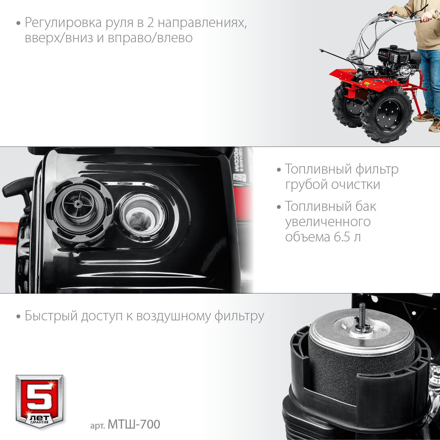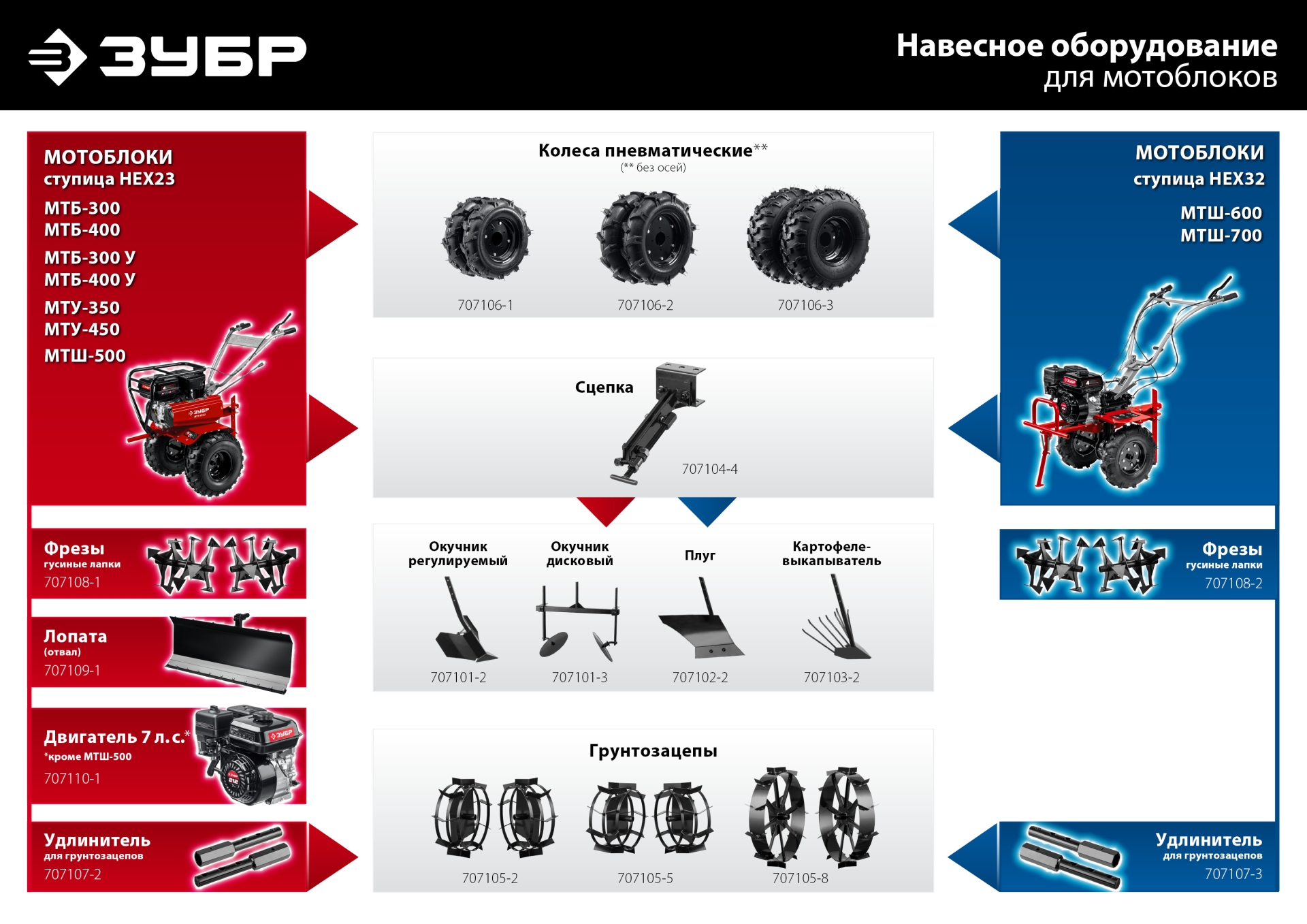 - Универсальная сцепка позволяет использовать различное навесное оборудование