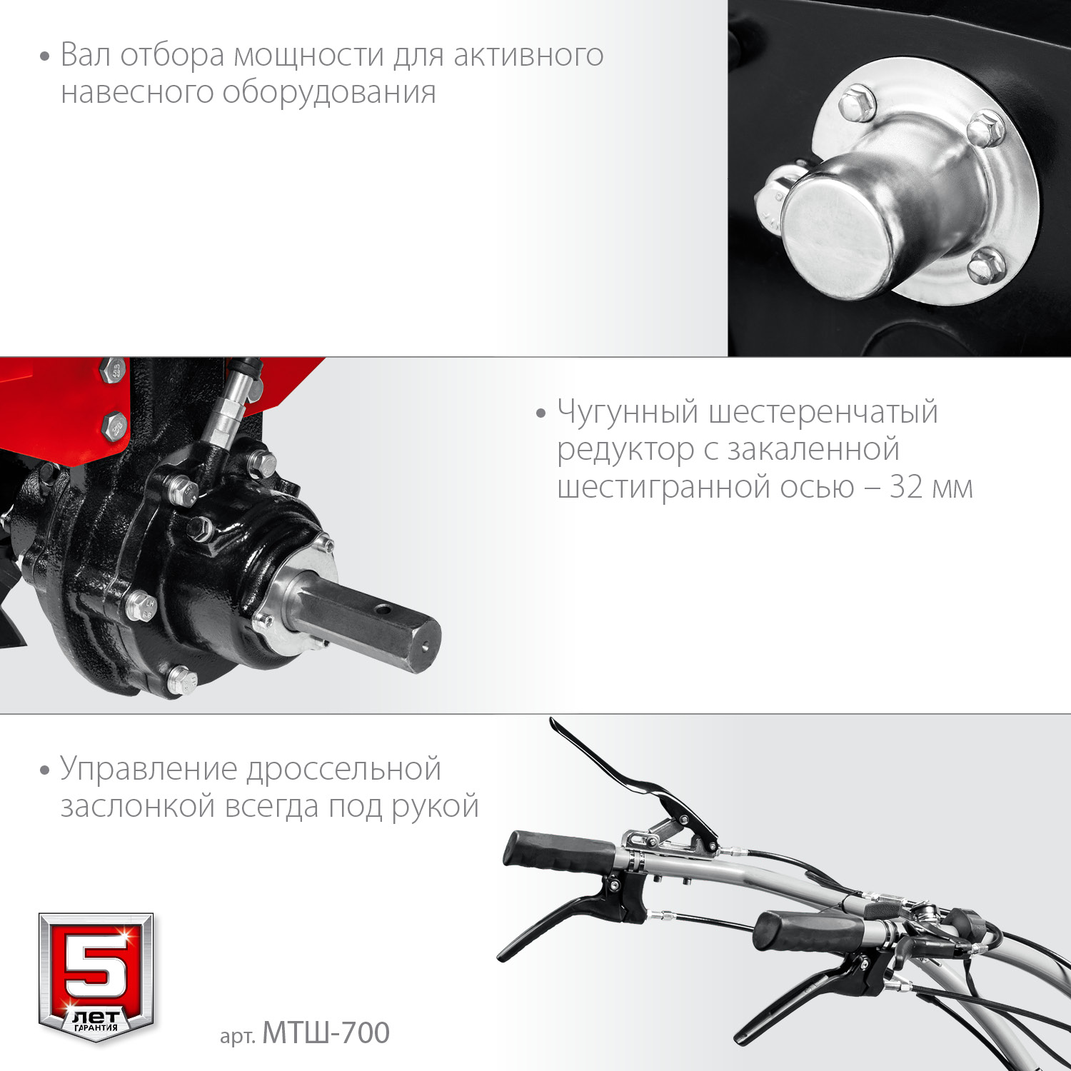 - 3 скорости вперед (понижающая, основная и повышающая) и 1 назад позволяют комфортно работать на любых типах почвы