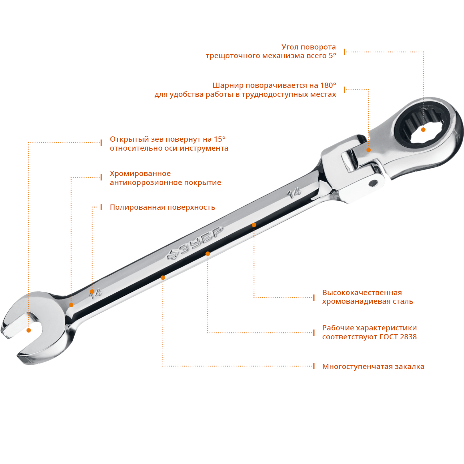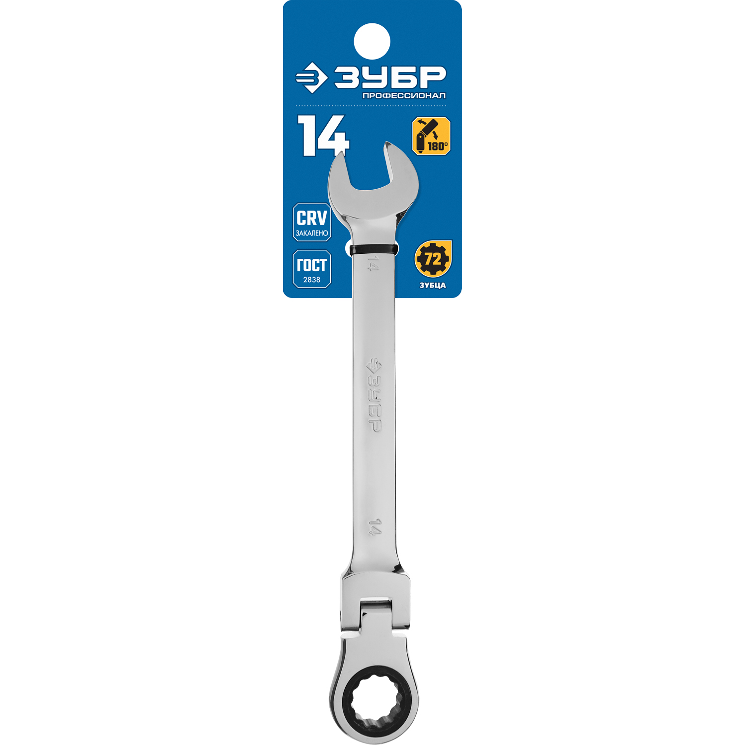ЗУБР 14 мм, шарнирный трещоточный гаечный ключ, Профессионал (27101-14)