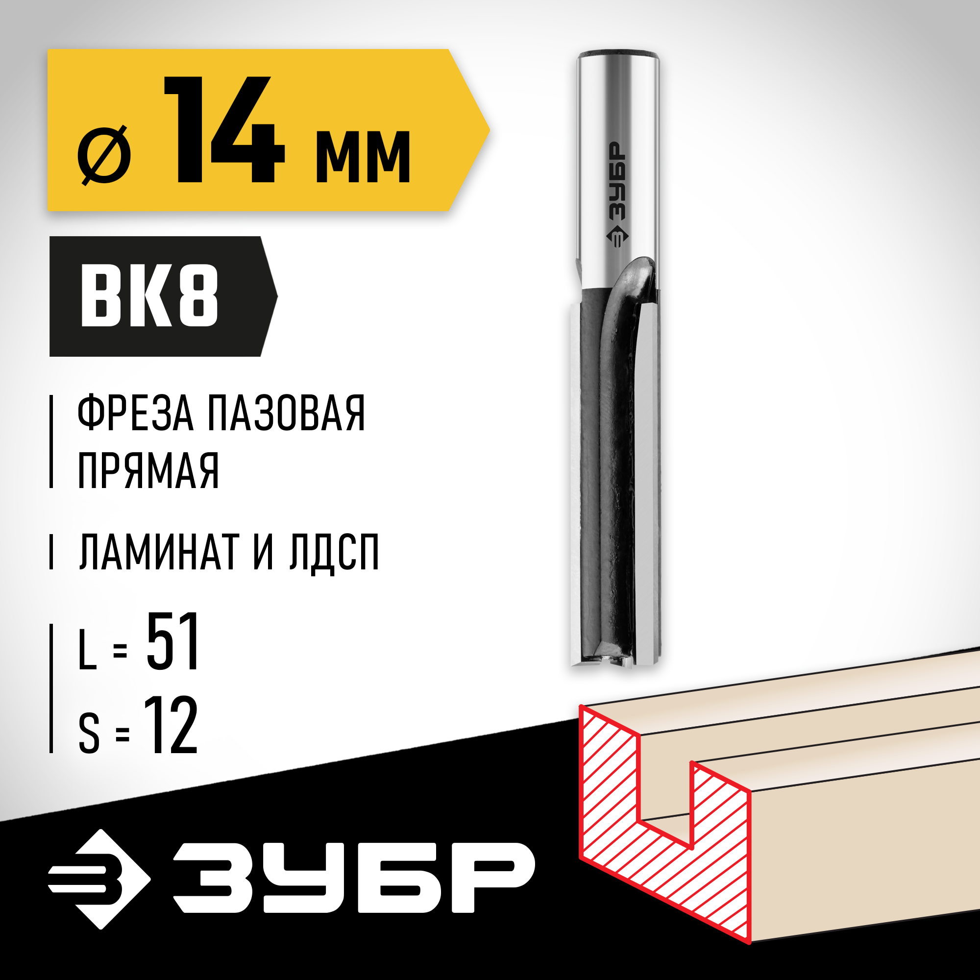 ЗУБР 14 x 51 мм, хвостовик 12 мм, фреза пазовая прямая, Профессионал (28780-14-51-12)