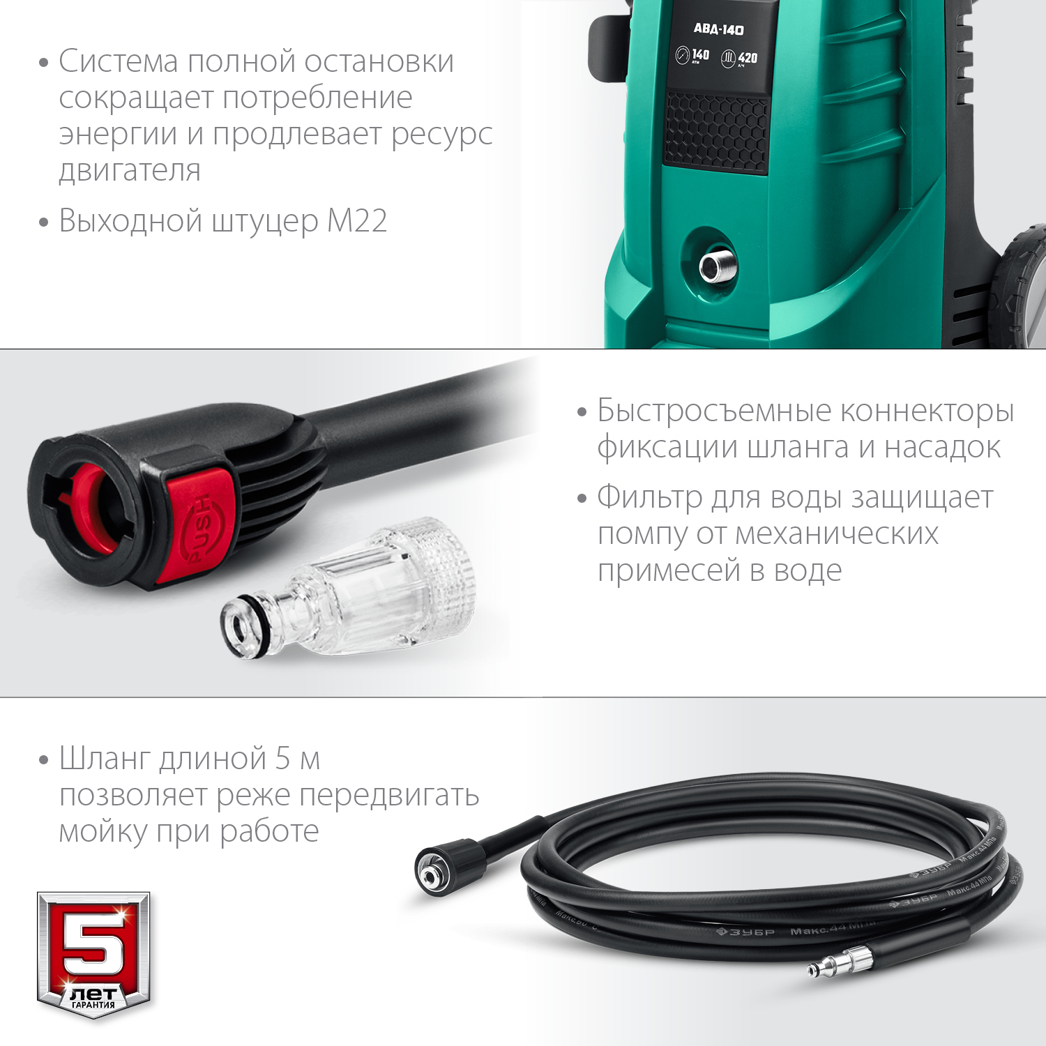 - Быстросъемное соединение шланга, распылителя и насадок позволяет оперативно собирать и переподключать компоненты