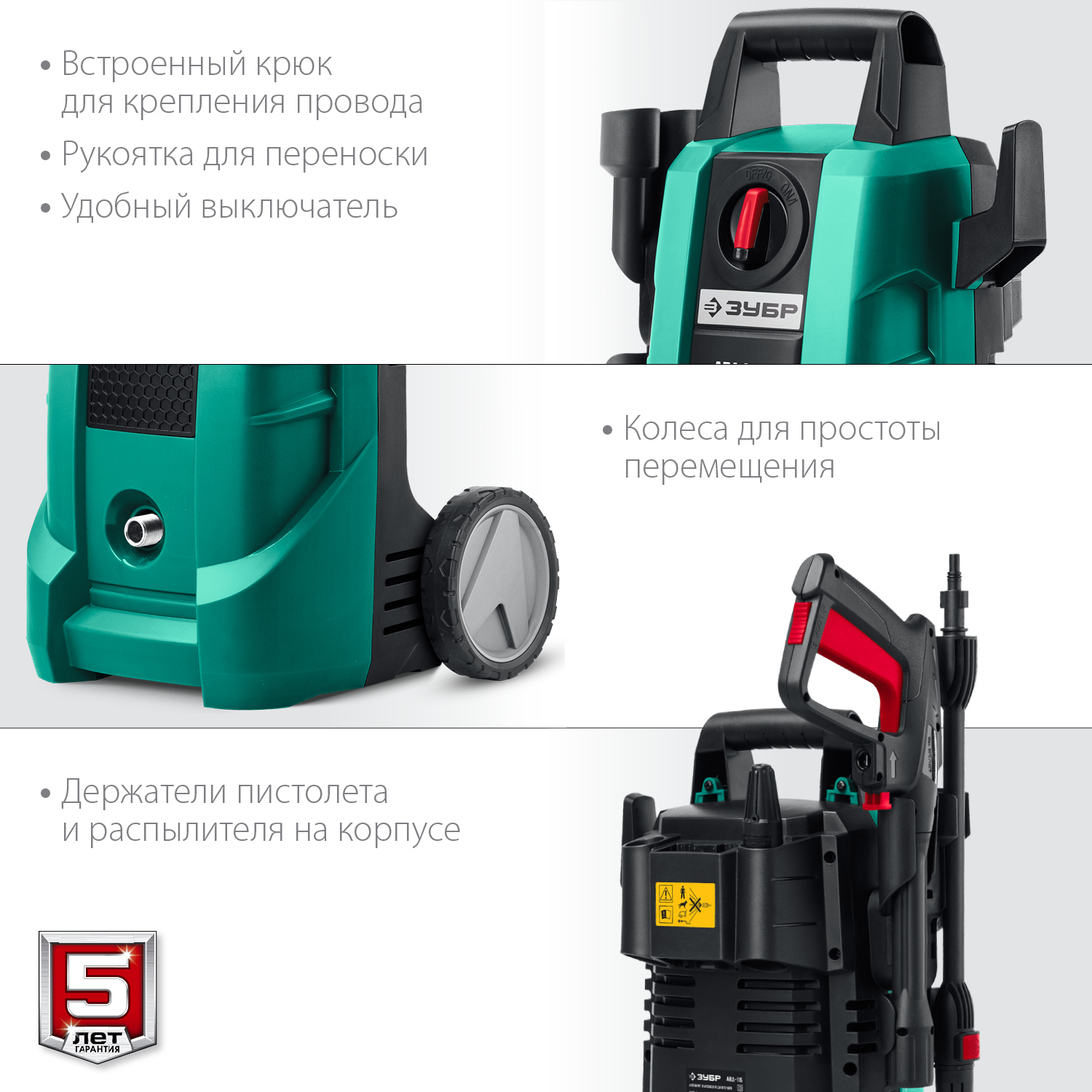 - Высокая мощность выходной струи для эффективной мойки