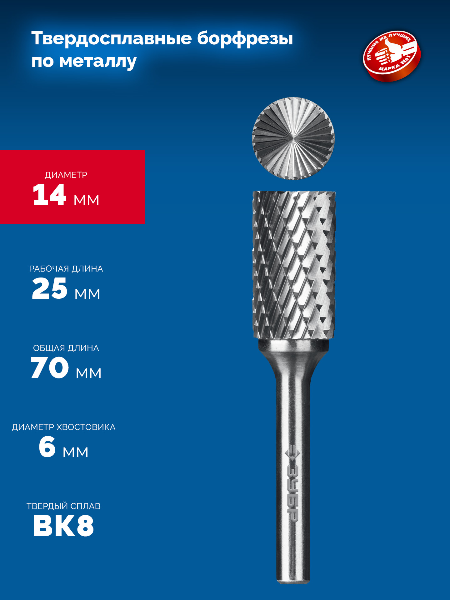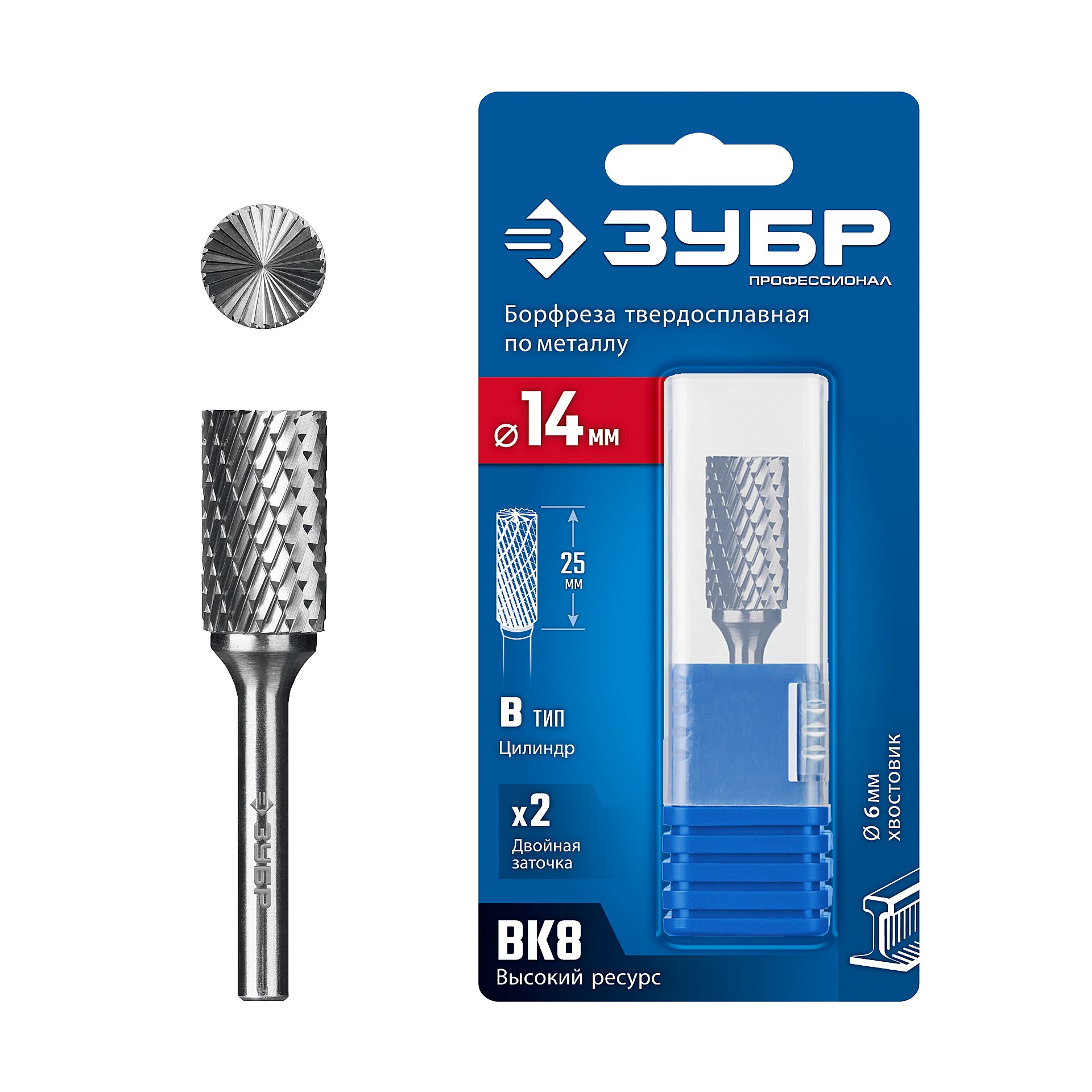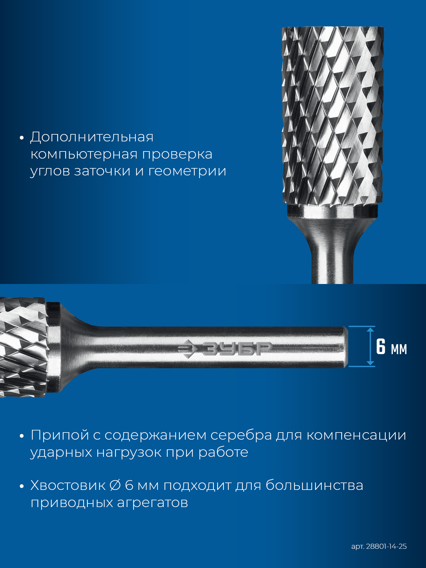 ЗУБР 14х25 мм, тип B (цилиндр с торцевыми зубьями), хв-к 6 мм, твердосплавная борфреза, ПРОФЕССИОНАЛ (28801-14-25)