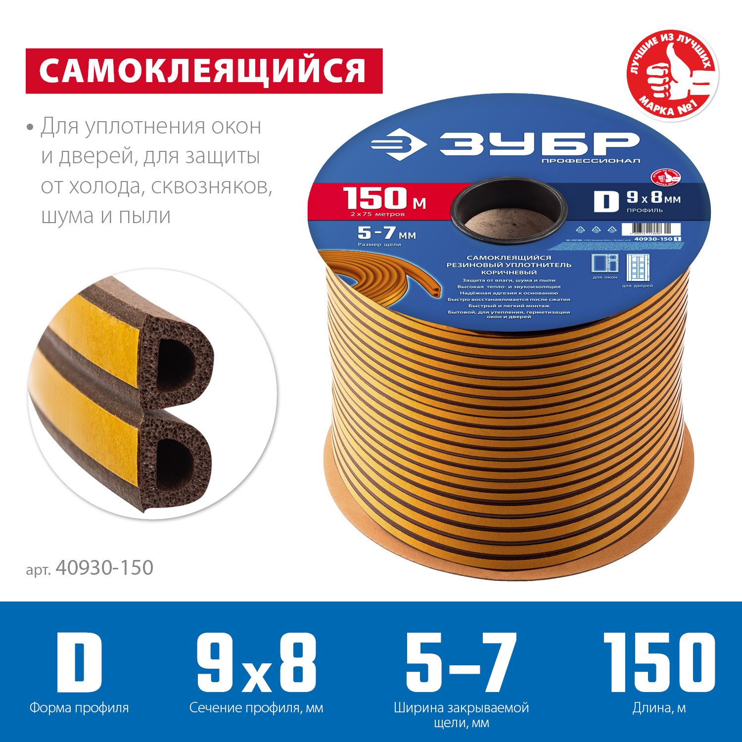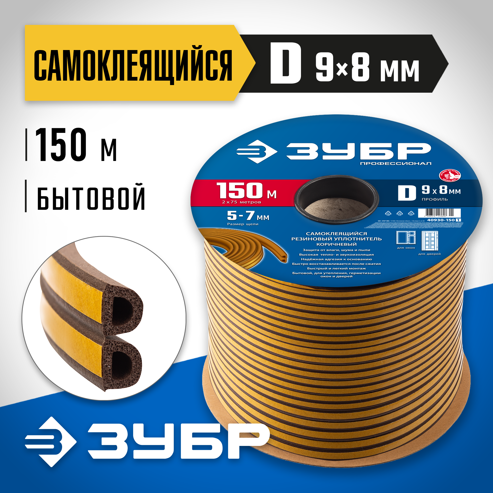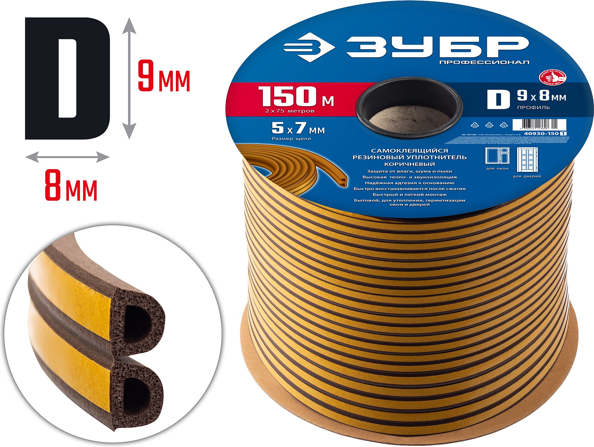 ЗУБР 150 м, D-профиль, размер 9 х 8 мм, коричневый, самоклеящийся резиновый уплотнитель, Профессионал (40930-150)