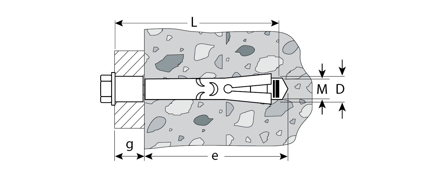 Для монтажа конструкций к полнотелым основаниям: поверхностям из бетона, полнотелого кирпича или природного камня. Анкер устанавливается в предварительно просверленное и очищенное от буровой муки отверстие и расклинивается при закручивании болта