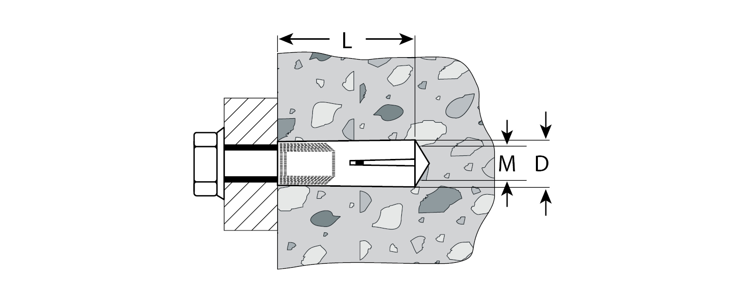 Для монтажа конструкций к полнотелым основаниям: поверхностям из бетона, полнотелого кирпича или природного камня. Анкер устанавливается в предварительно просверленное и очищенное от буровой муки отверстие и расклинивается при закручивании болта