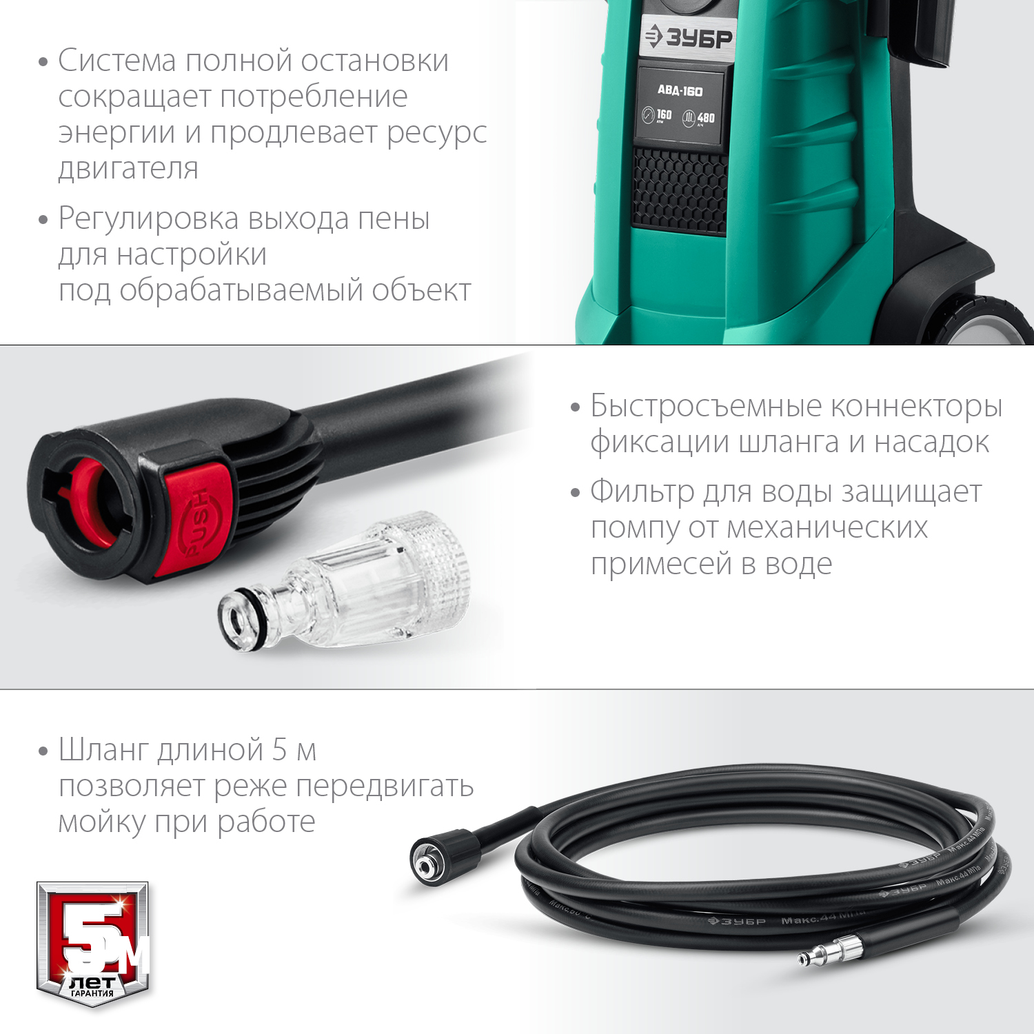 - Быстросъемное соединение шланга, распылителя и насадок позволяет оперативно собирать и переподключать компоненты