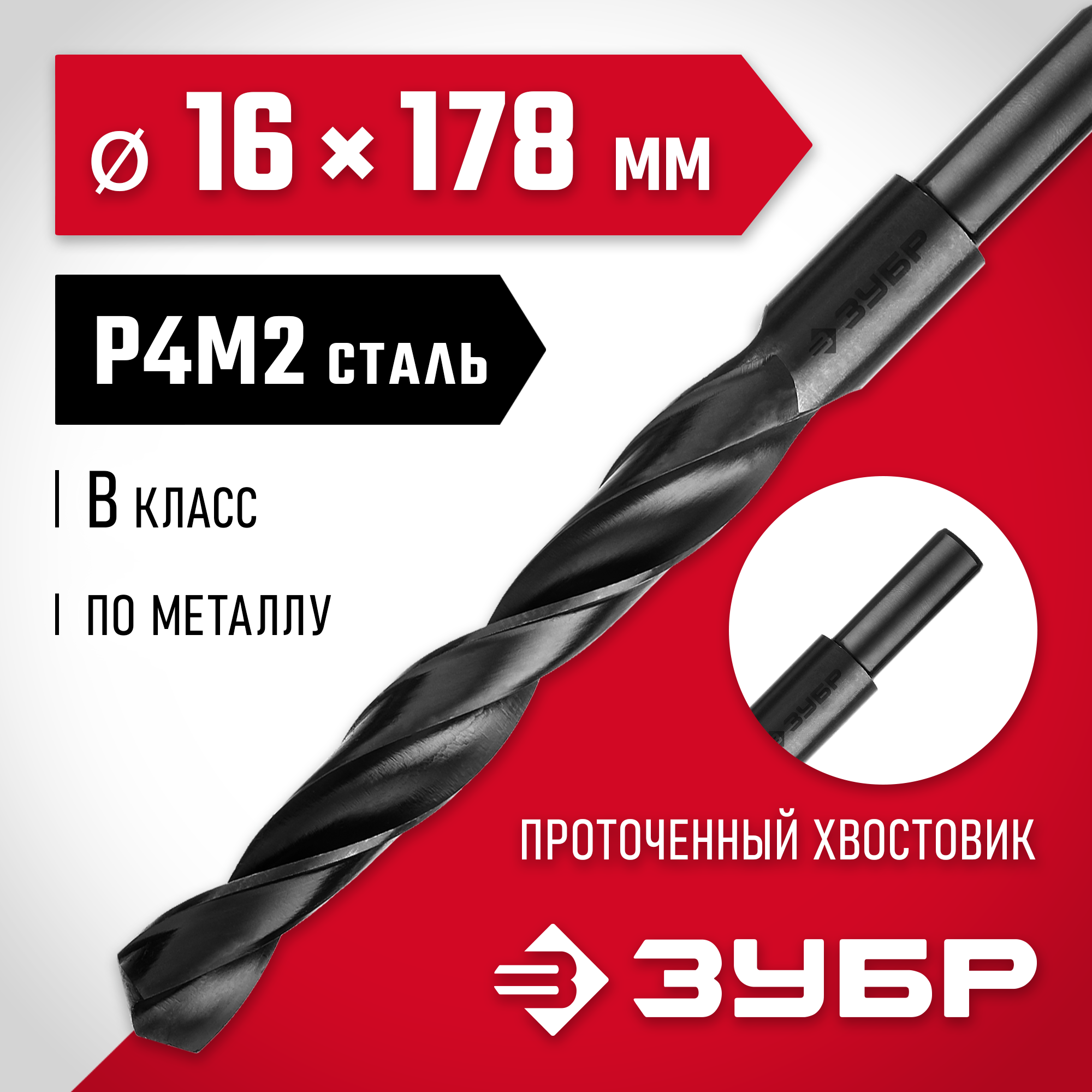 ЗУБР 16.0 х 178 мм, сталь Р4М2, класс В, проточенный хвостовик, сверло по металлу (29605-16)