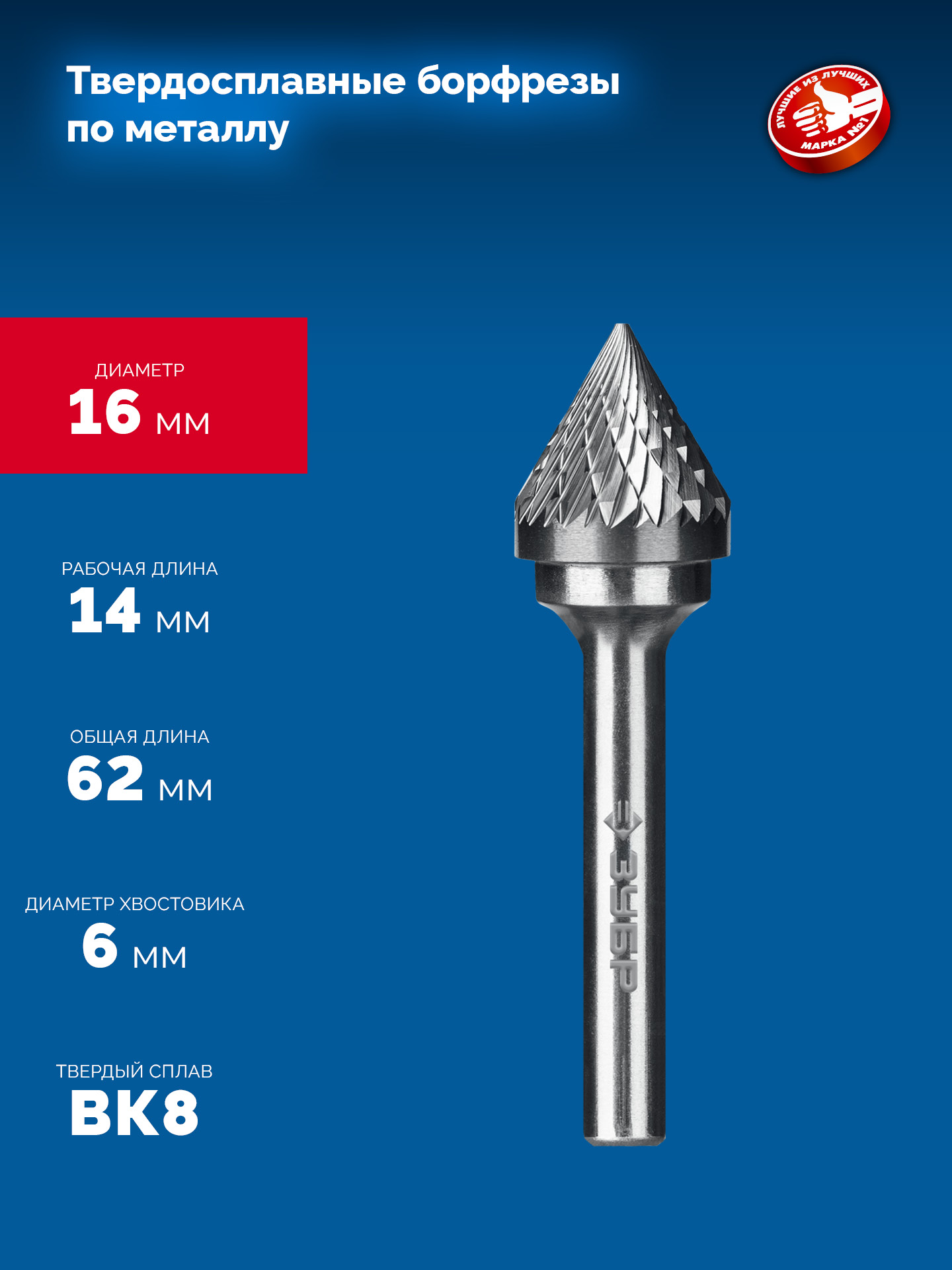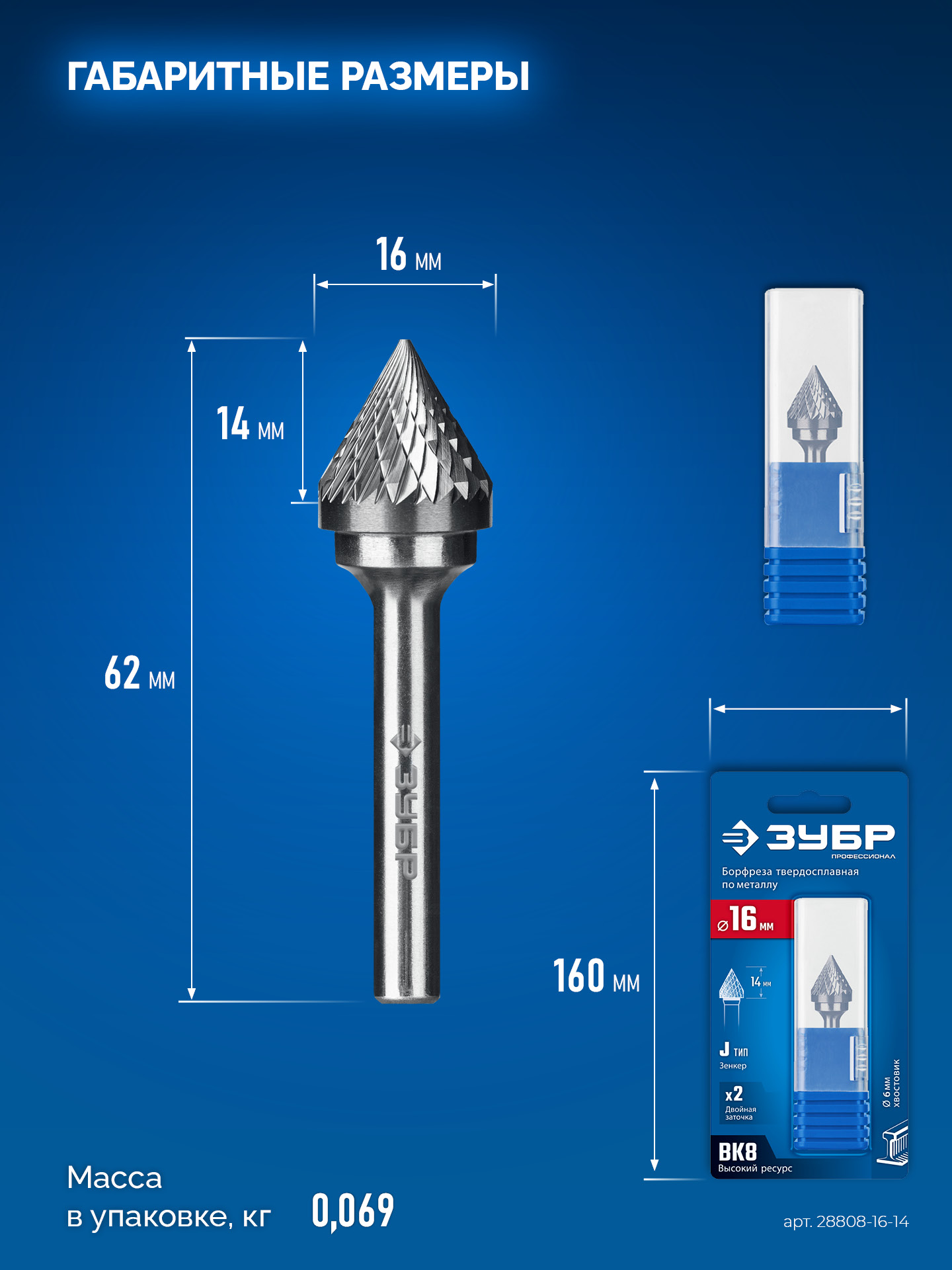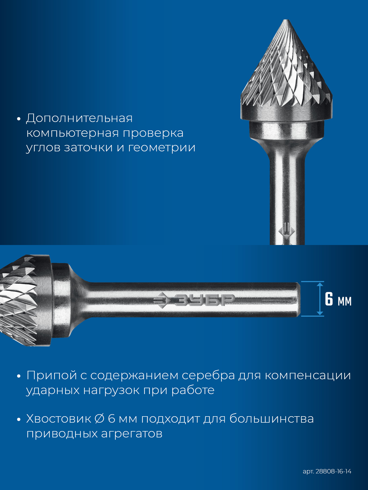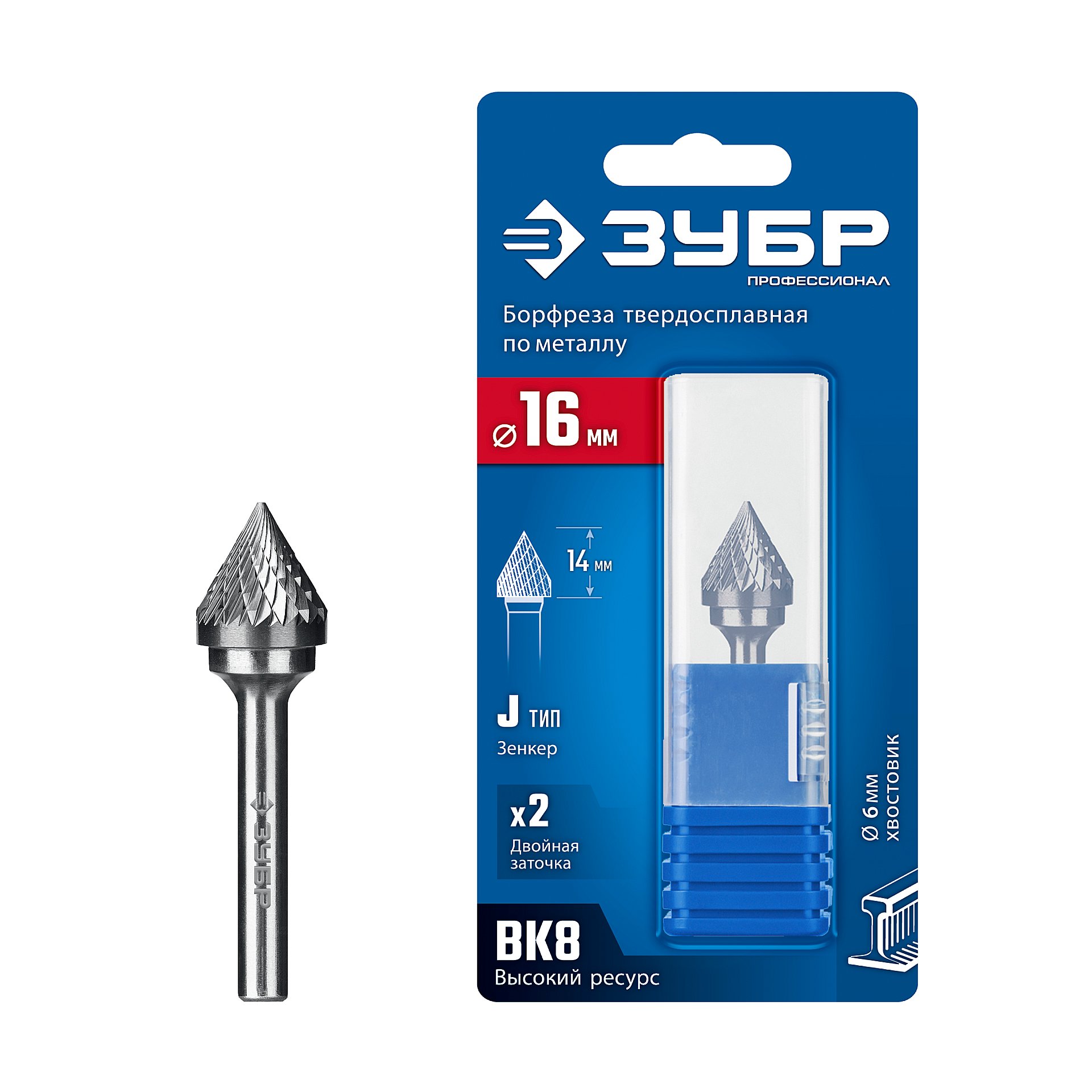 ЗУБР 16х14 мм, тип J (зенкер с вершиной 60°), хв-к 6 мм, твердосплавная борфреза, ПРОФЕССИОНАЛ (28808-16-14)