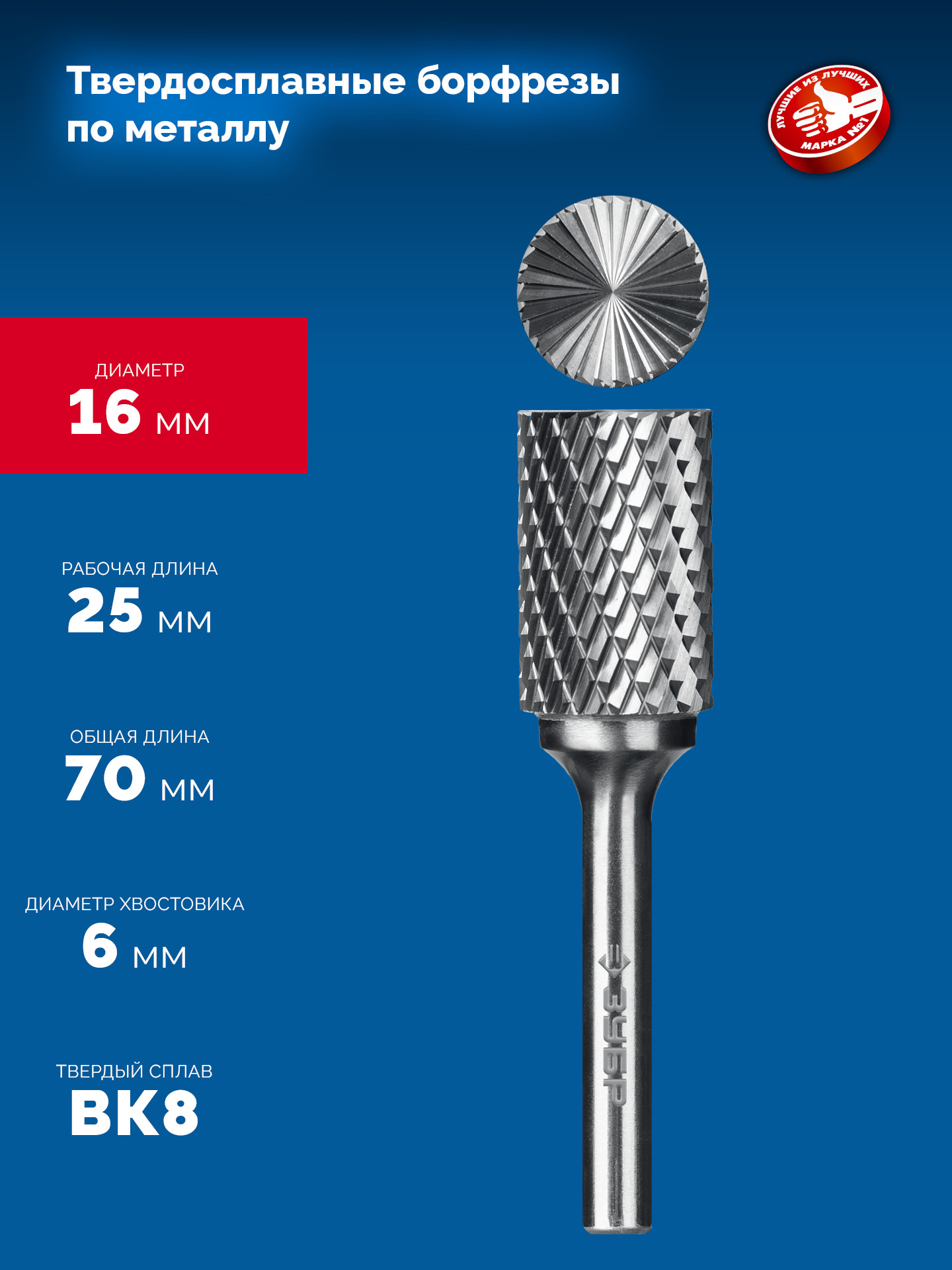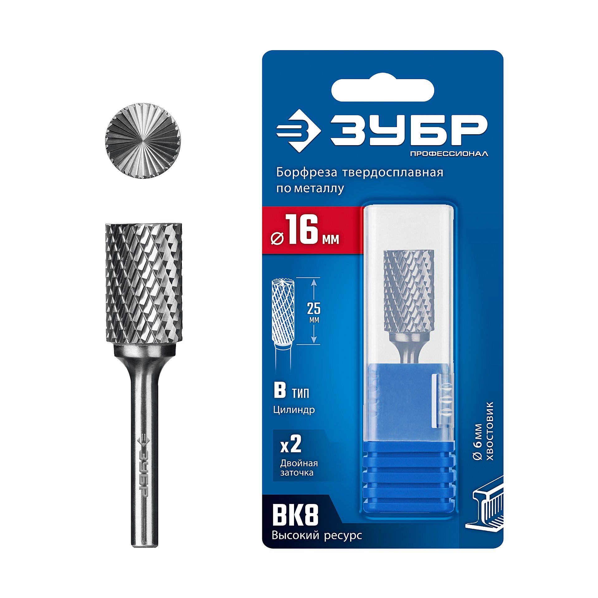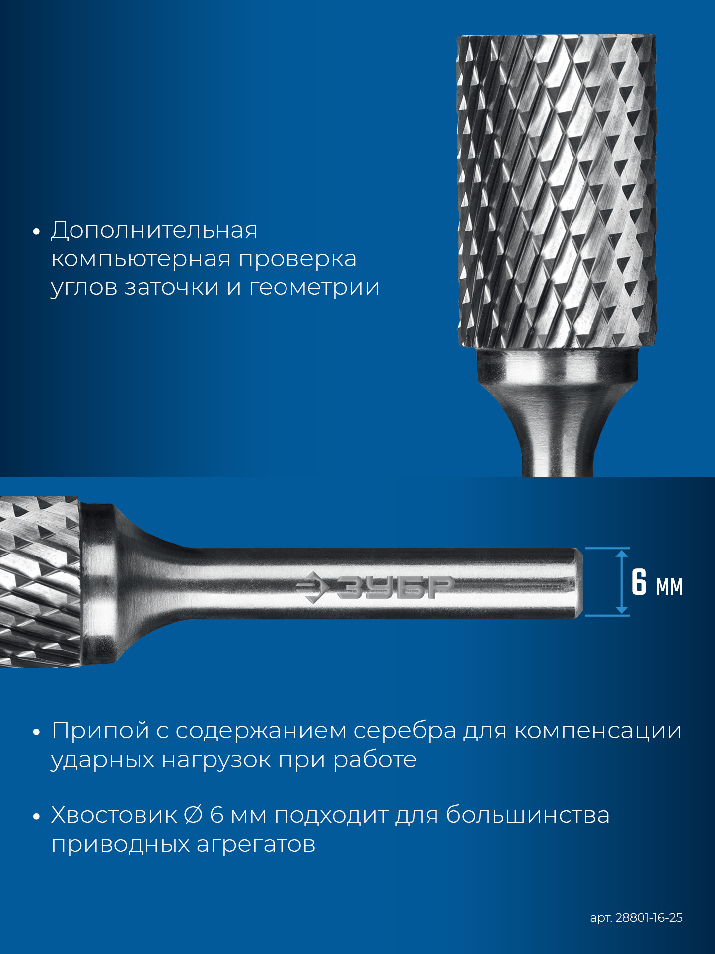 ЗУБР 16х25 мм, тип B (цилиндр с торцевыми зубьями), хв-к 6 мм, твердосплавная борфреза, ПРОФЕССИОНАЛ (28801-16-25)