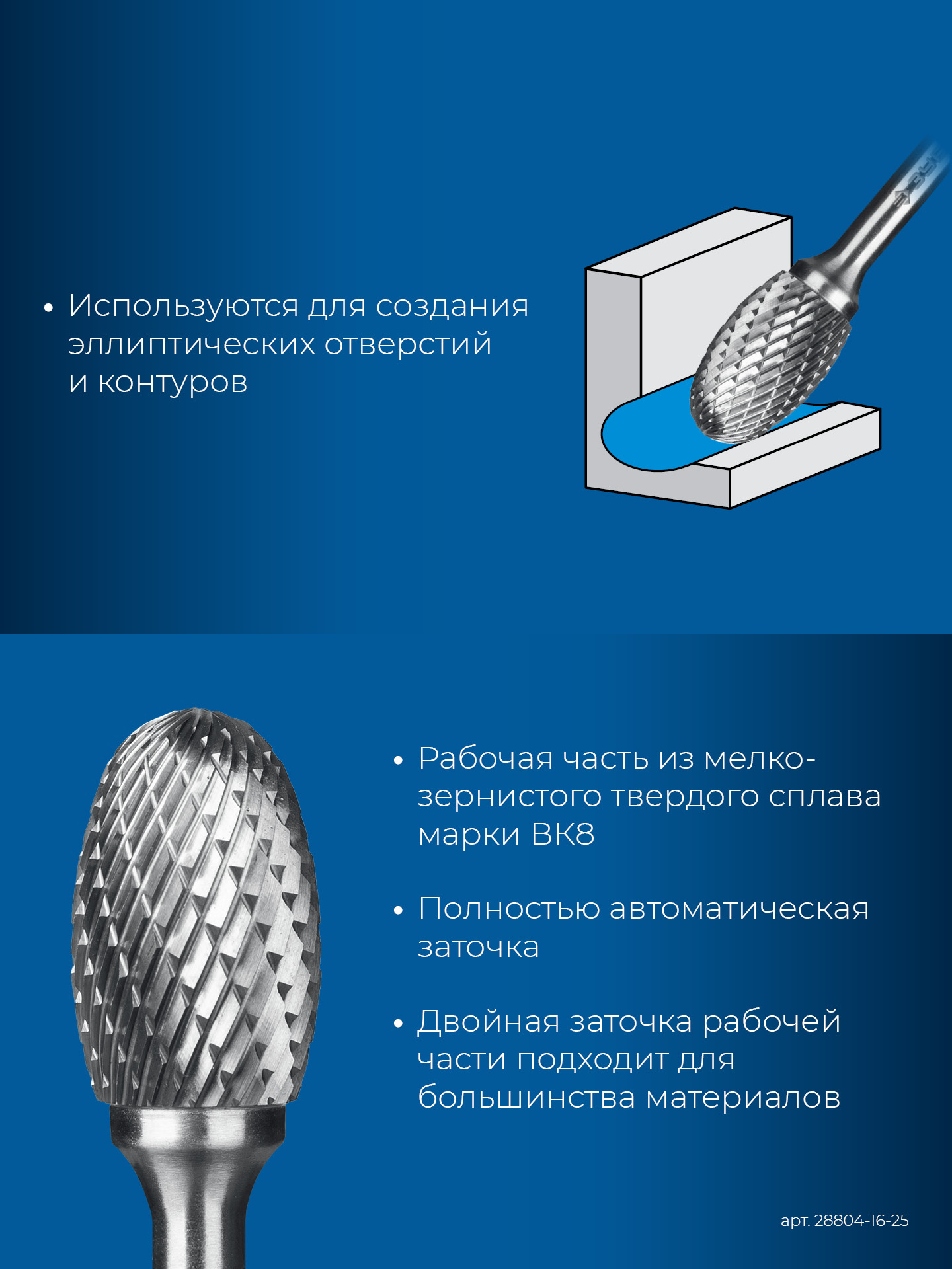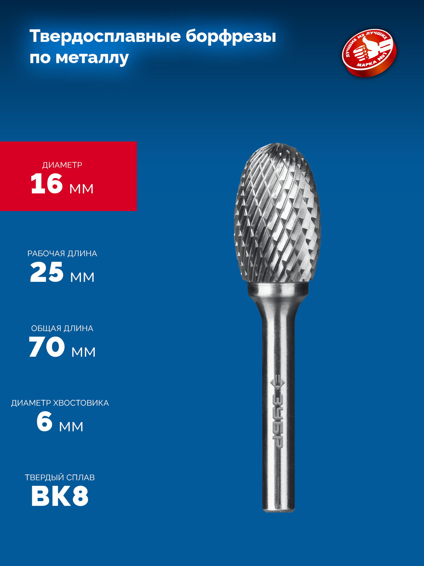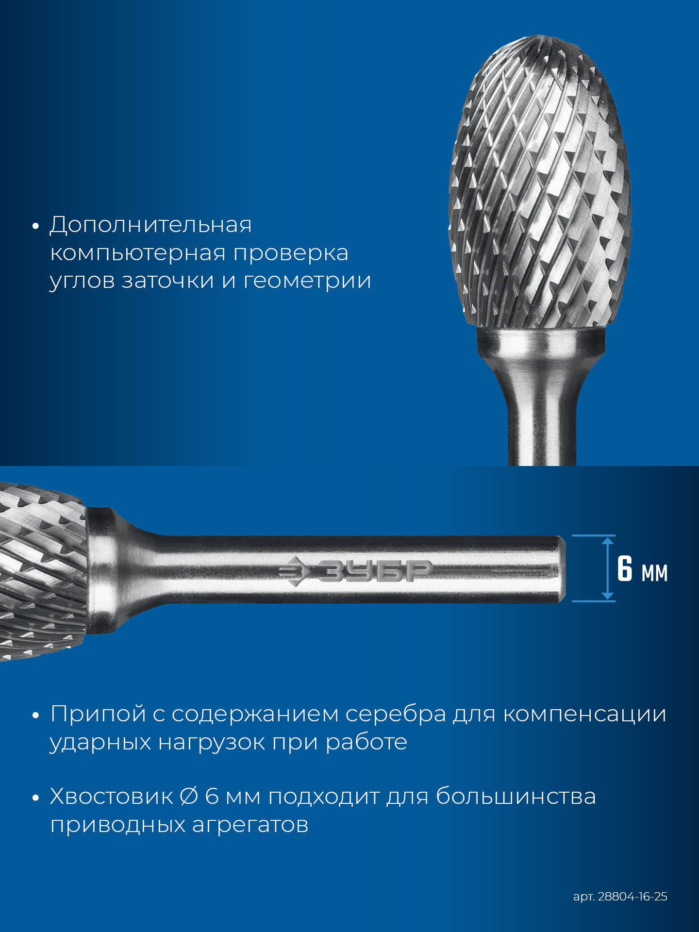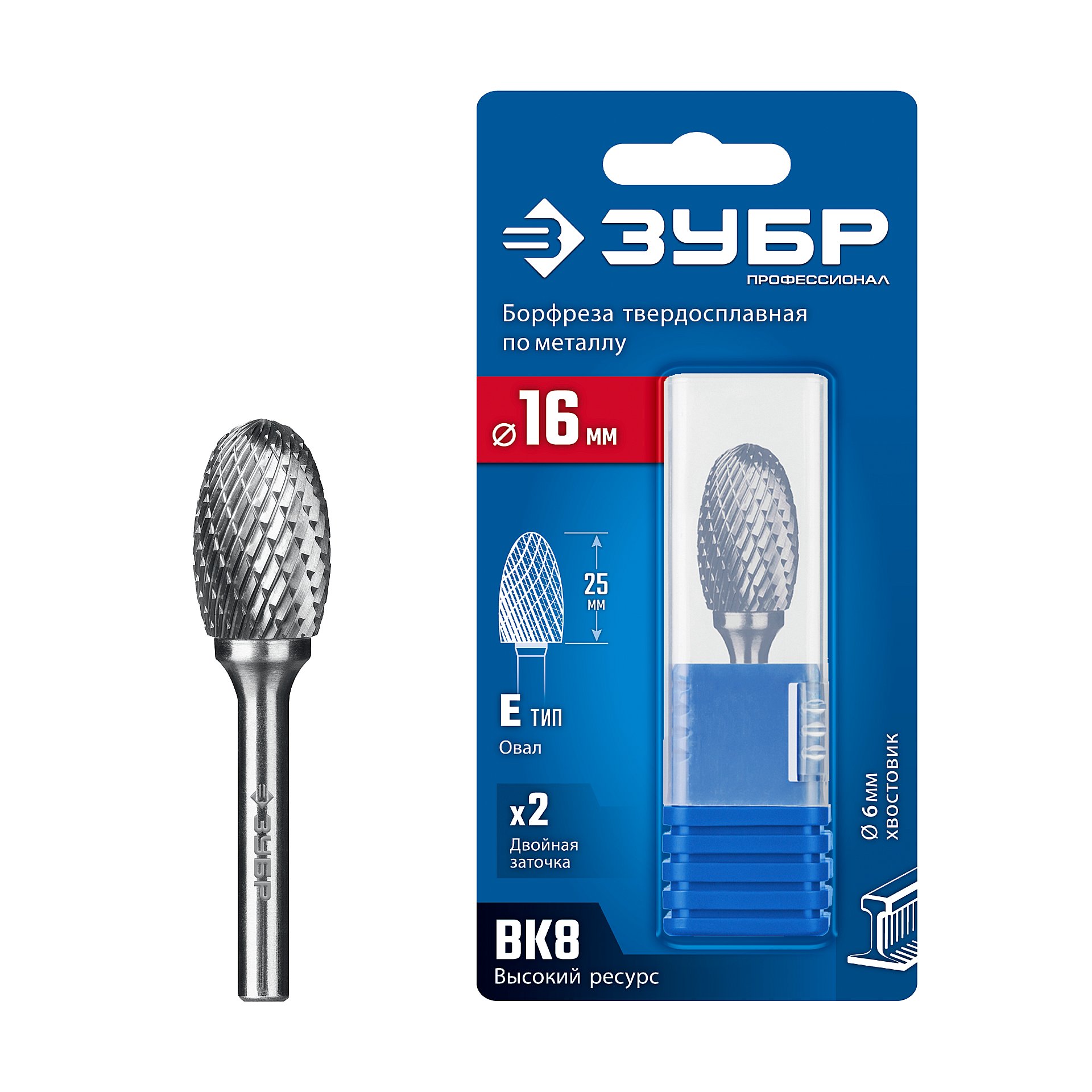 ЗУБР 16х25 мм, тип E (овал, радиус 6.5 мм), хв-к 6 мм, твердосплавная борфреза, ПРОФЕССИОНАЛ (28804-16-25)