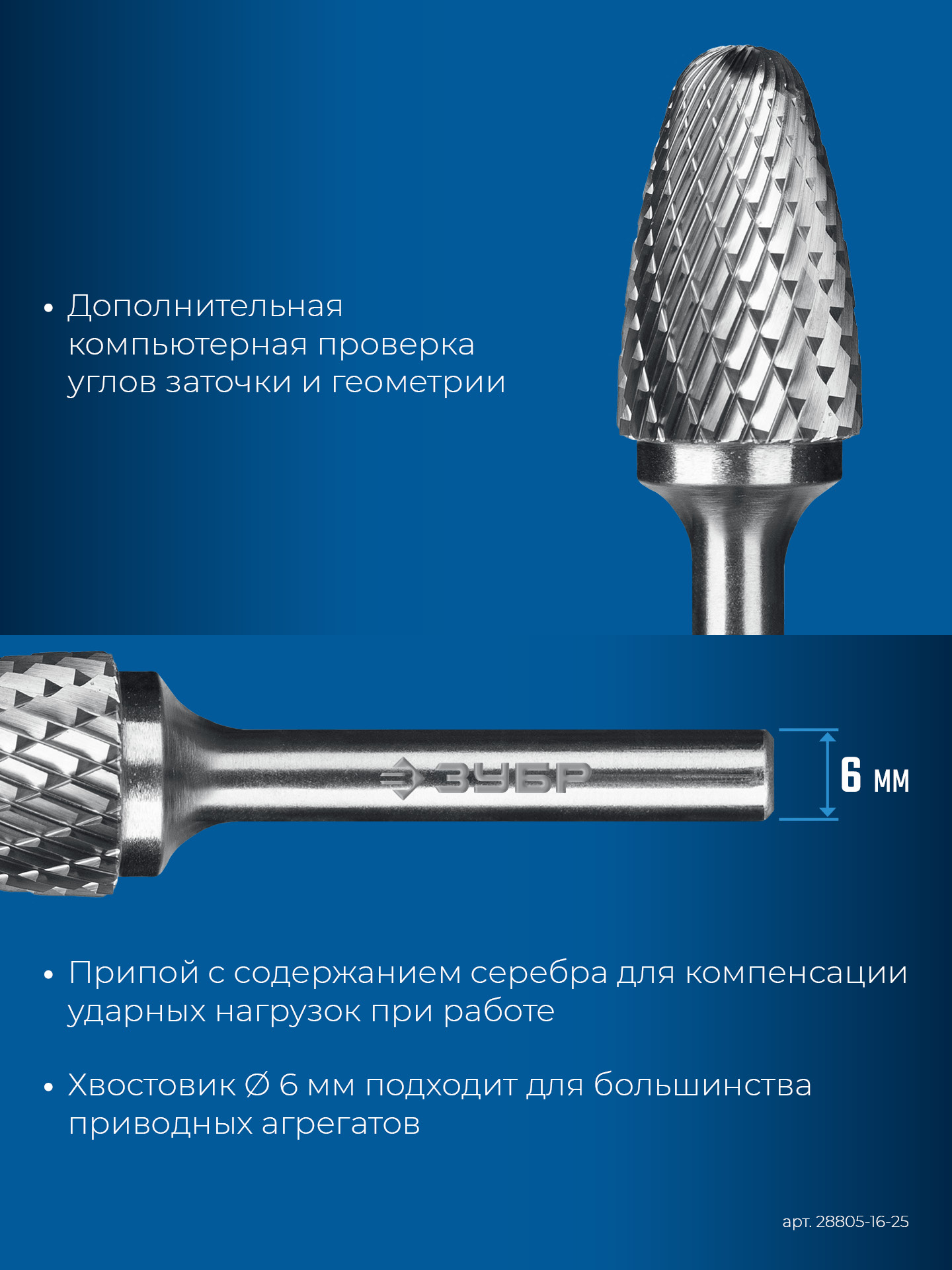 ЗУБР 16х25 мм, тип F (парабола с закругленным углом, радиус 4.0 мм), хв-к 6 мм, твердосплавная борфреза, ПРОФЕССИОНАЛ (28805-16-25)