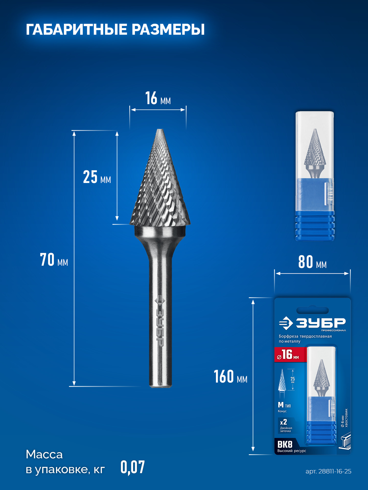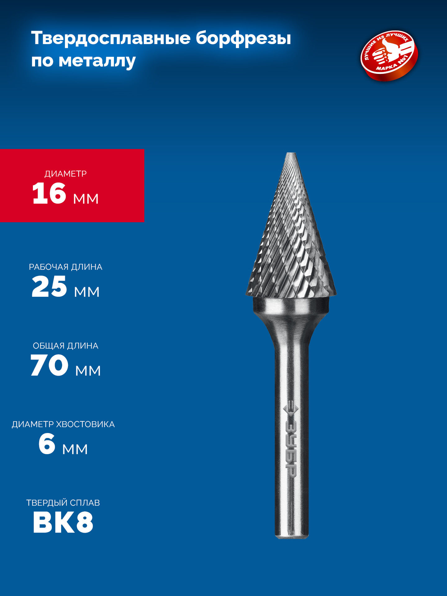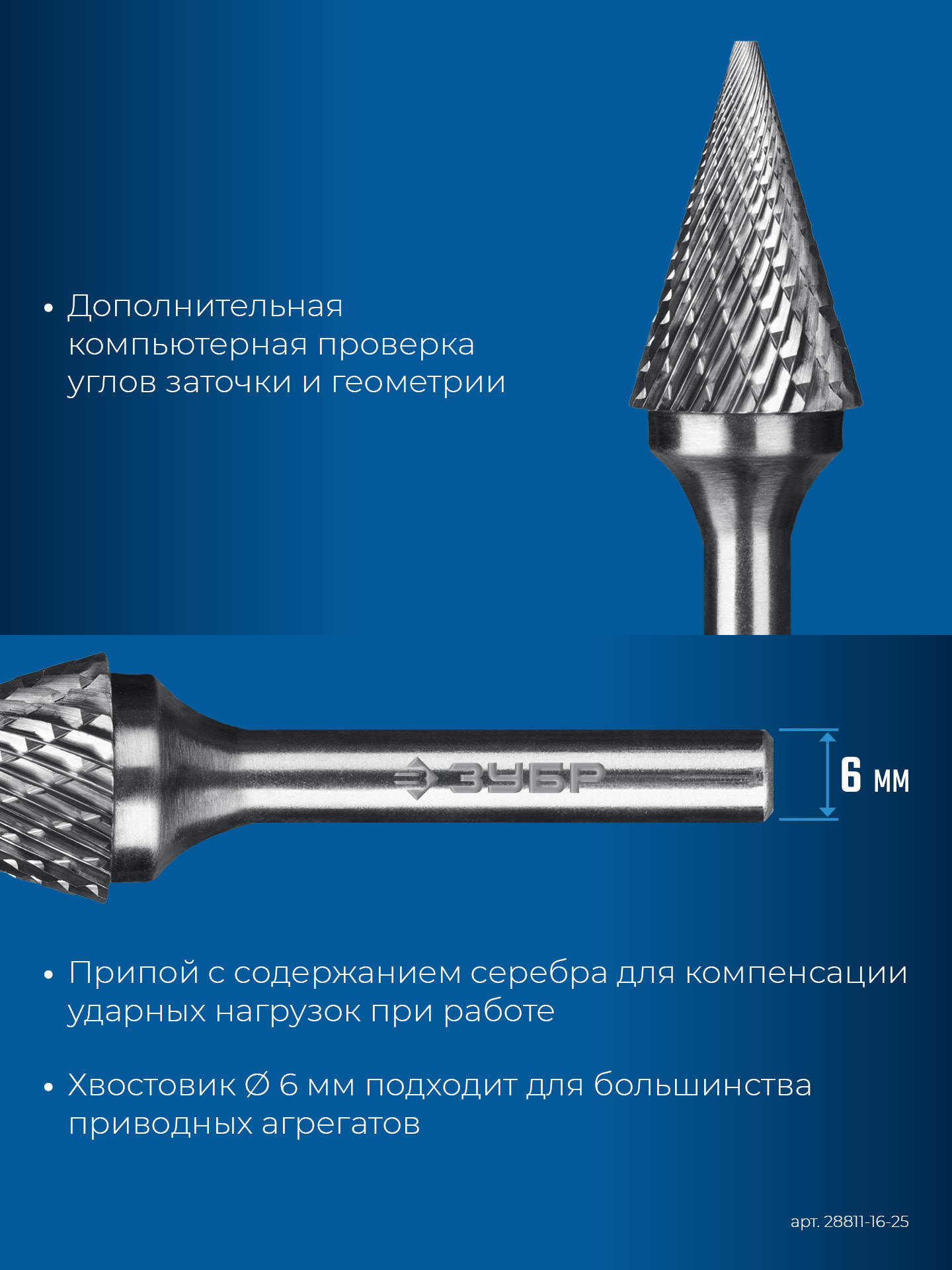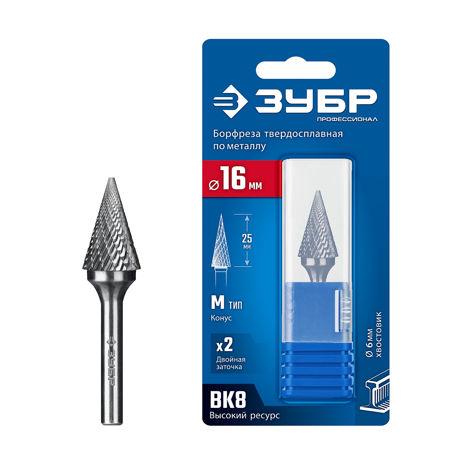 ЗУБР 16х25 мм, тип M (конус с острым углом 30°), хв-к 6 мм, твердосплавная борфреза, ПРОФЕССИОНАЛ (28811-16-25)