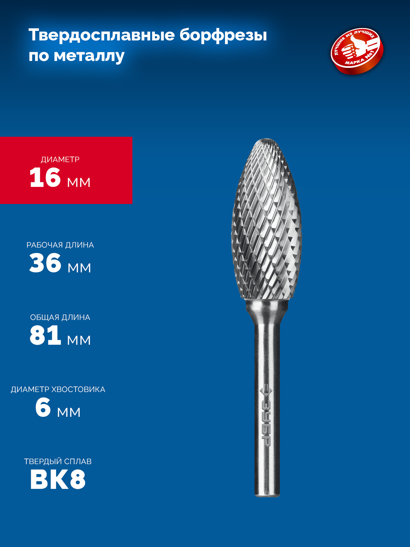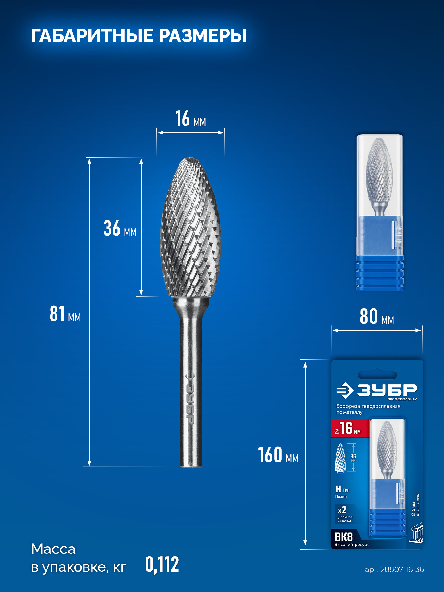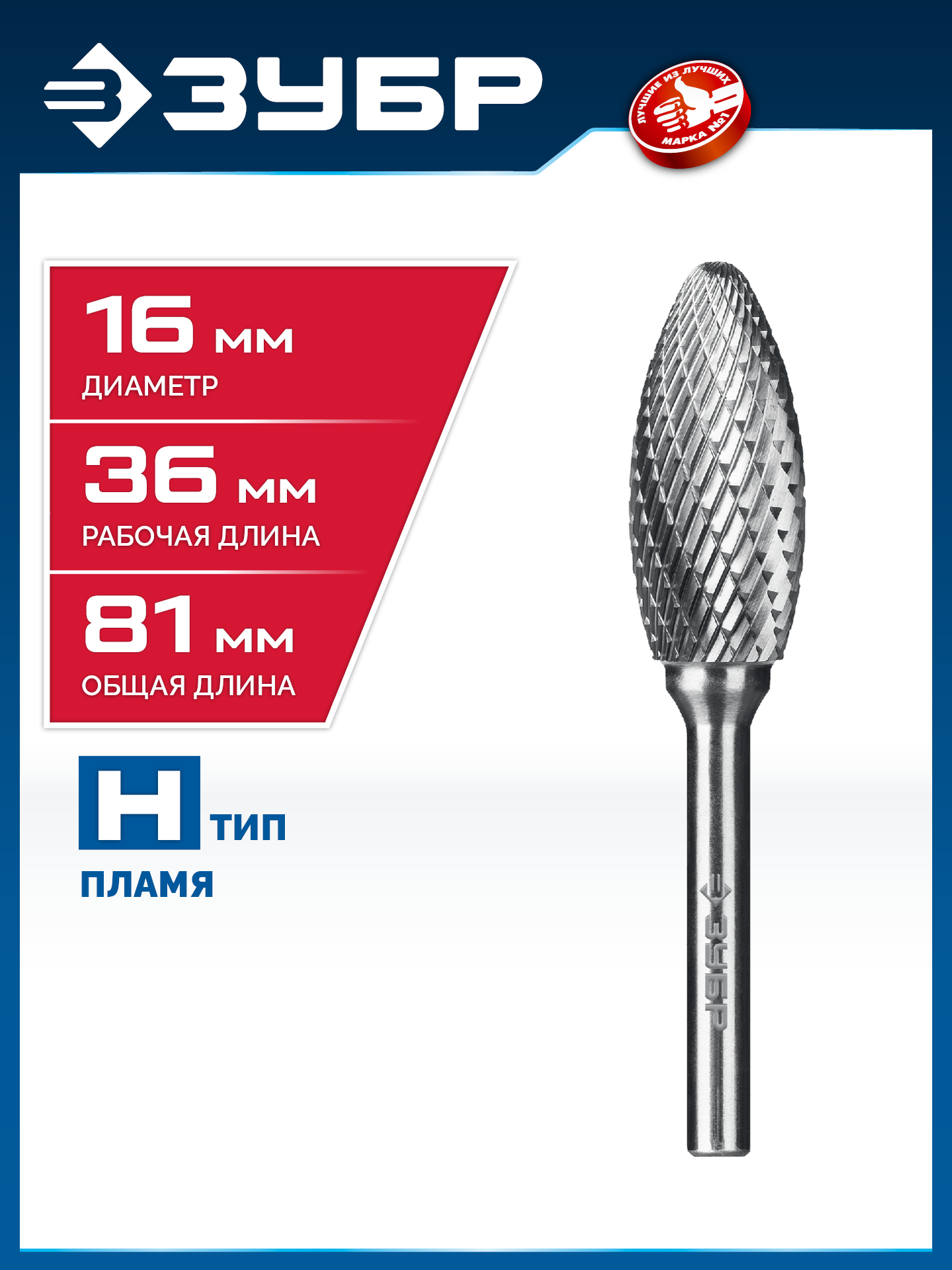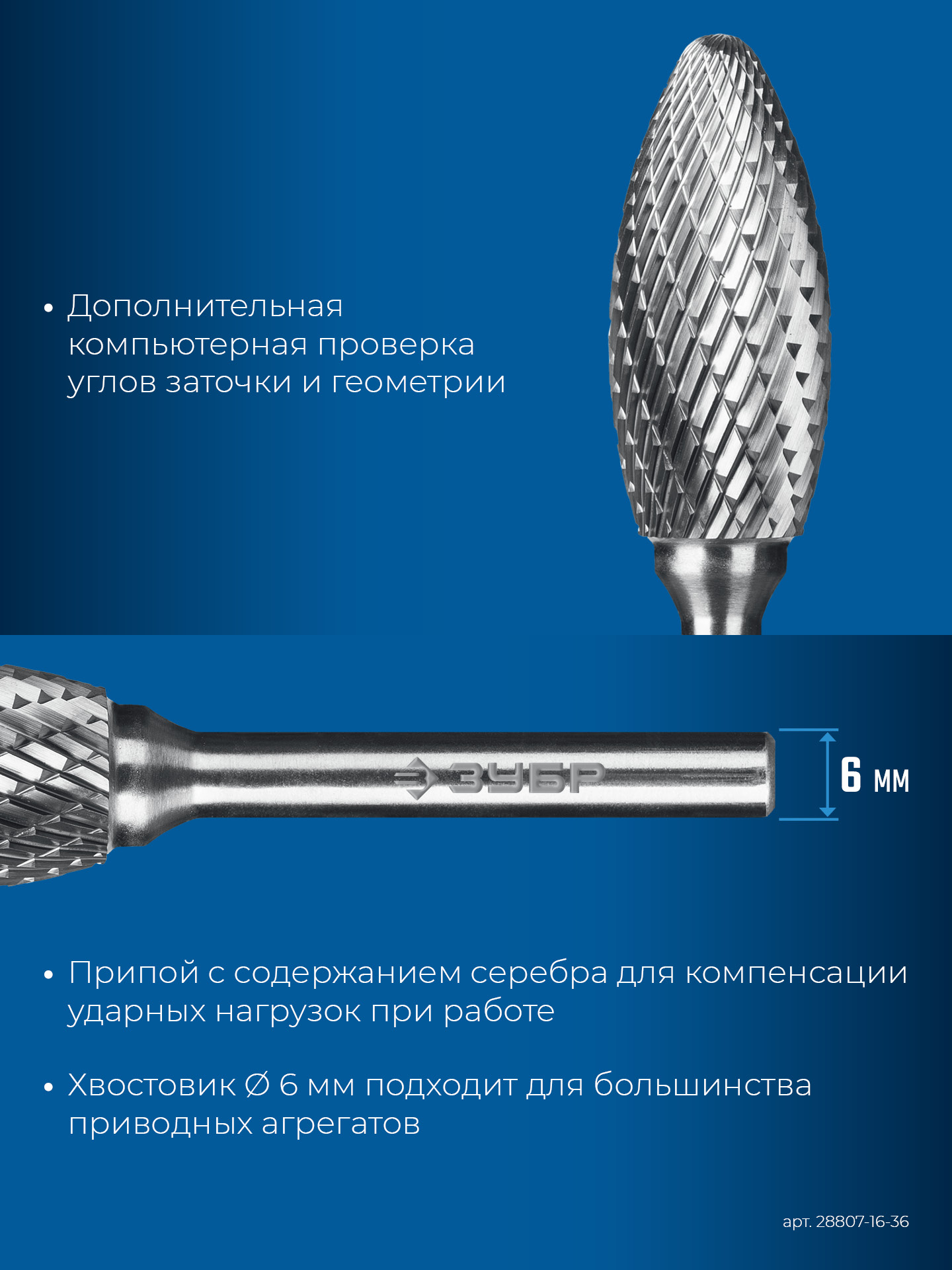 ЗУБР 16х36 мм, тип H (пламя, радиус 2.5 мм), хв-к 6 мм, твердосплавная борфреза, ПРОФЕССИОНАЛ (28807-16-36)