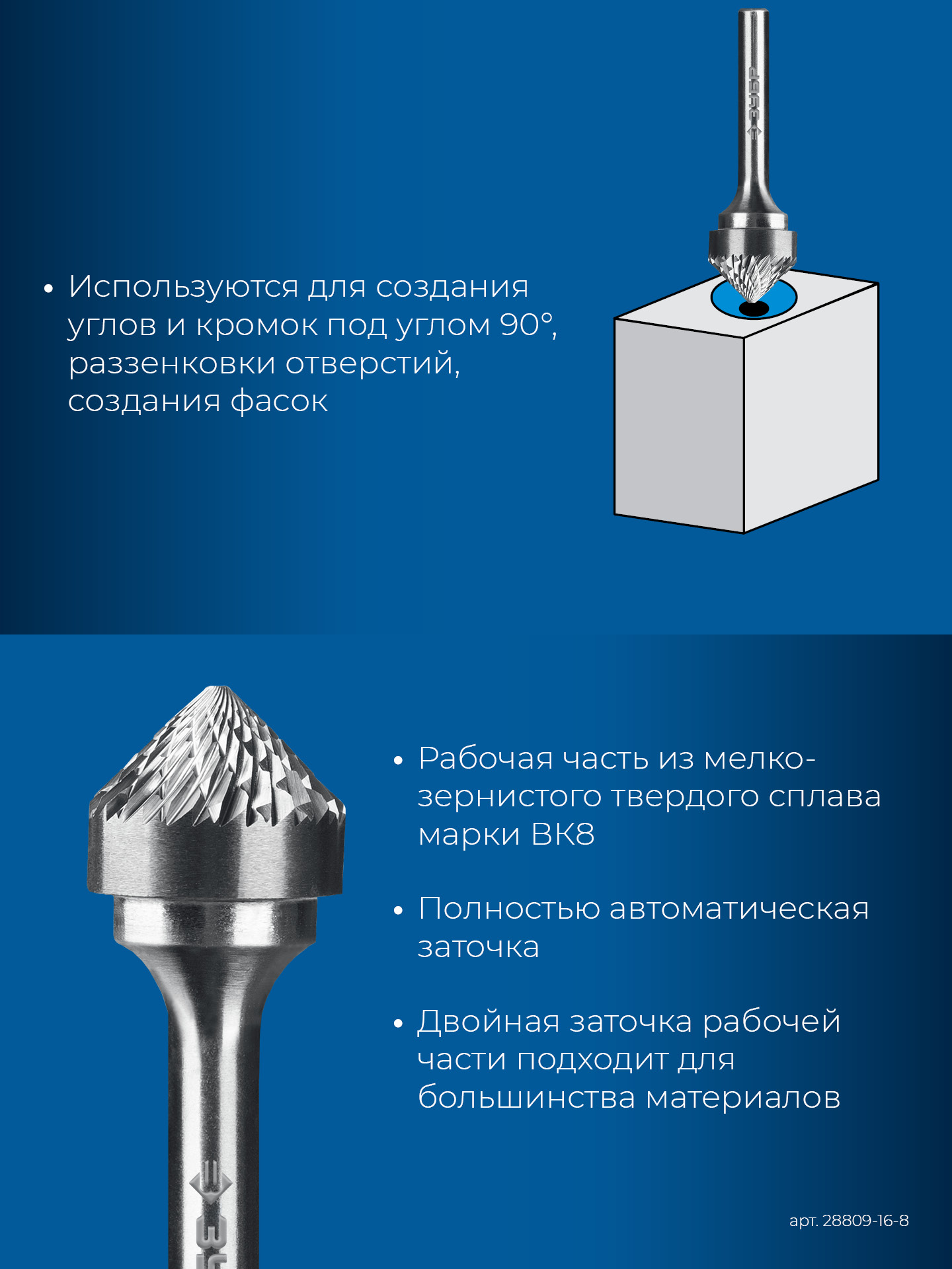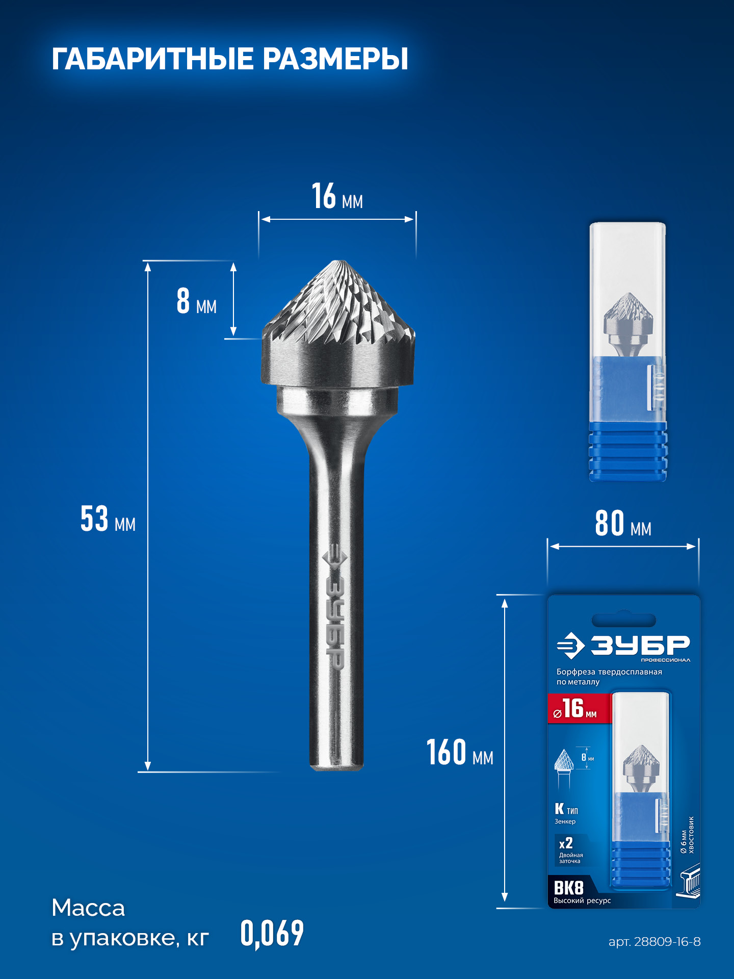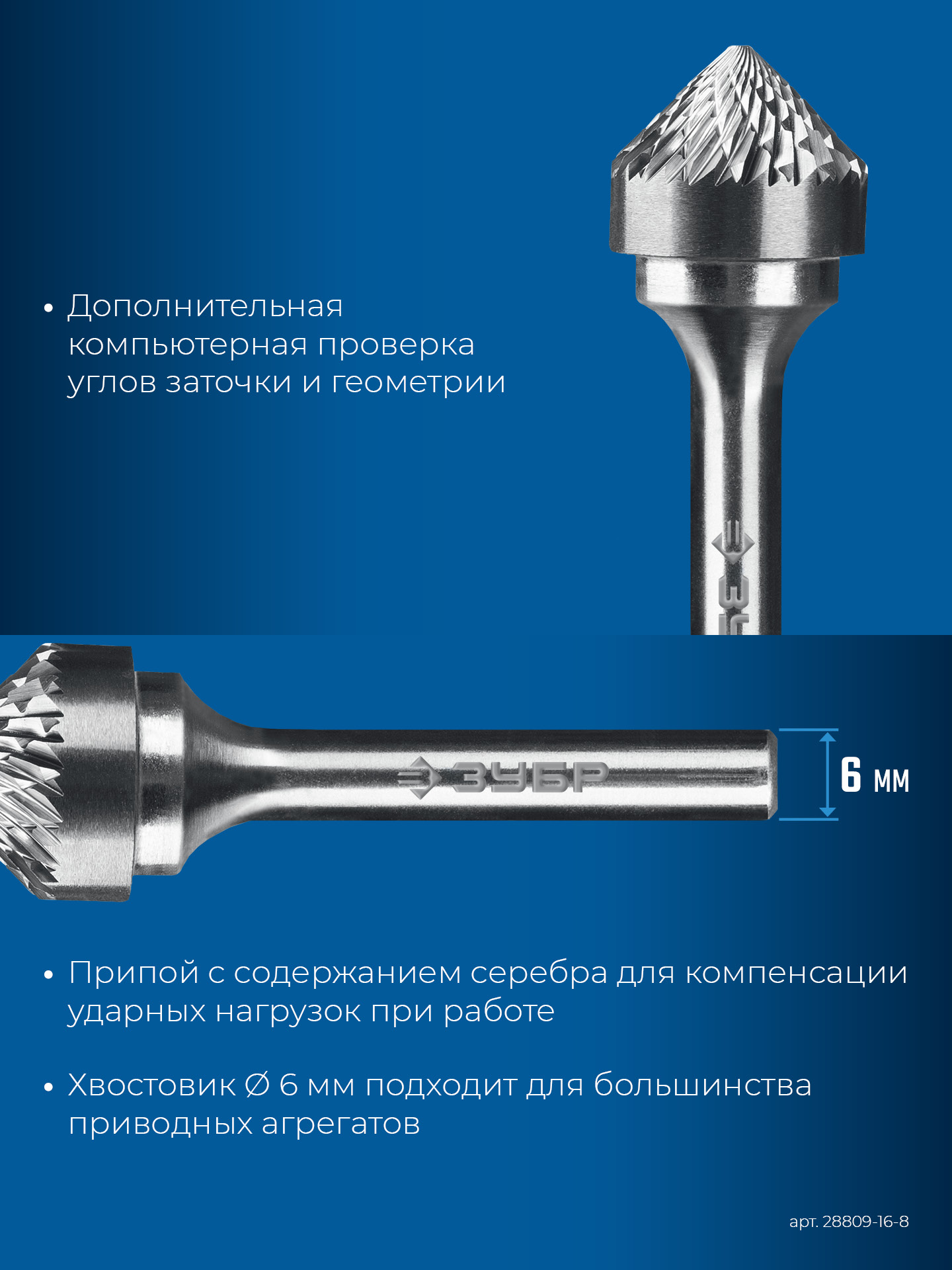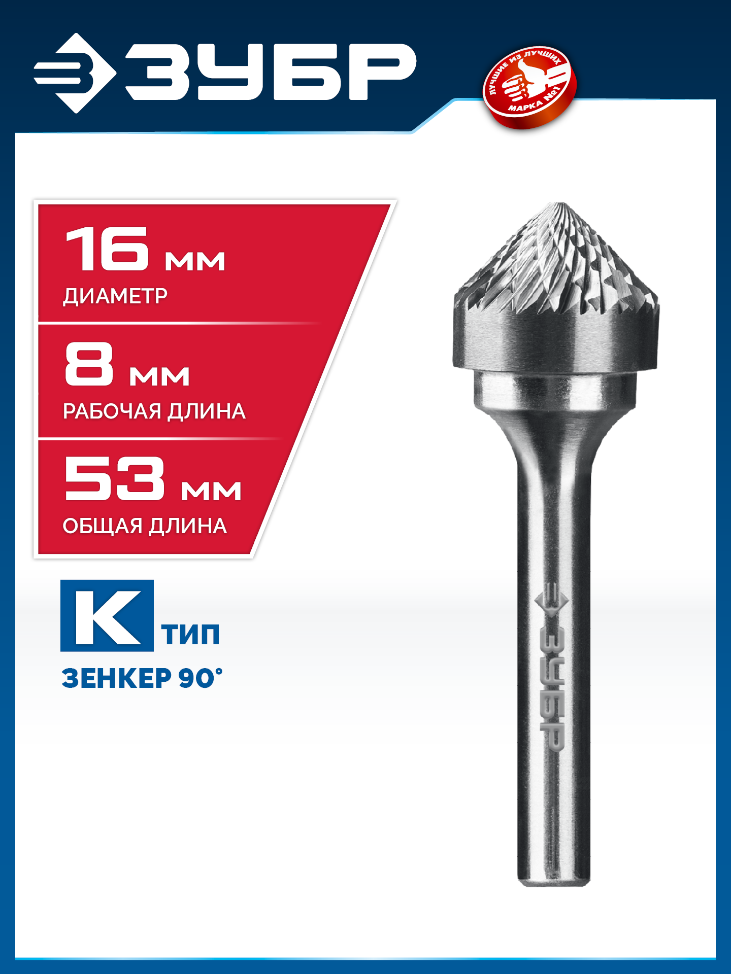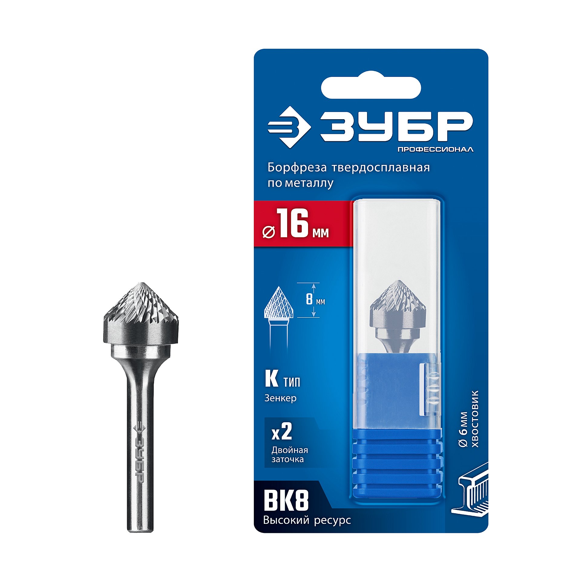 ЗУБР 16х8 мм, тип K (зенкер с вершиной 90°), хв-к 6 мм, твердосплавная борфреза, ПРОФЕССИОНАЛ (28809-16-8)