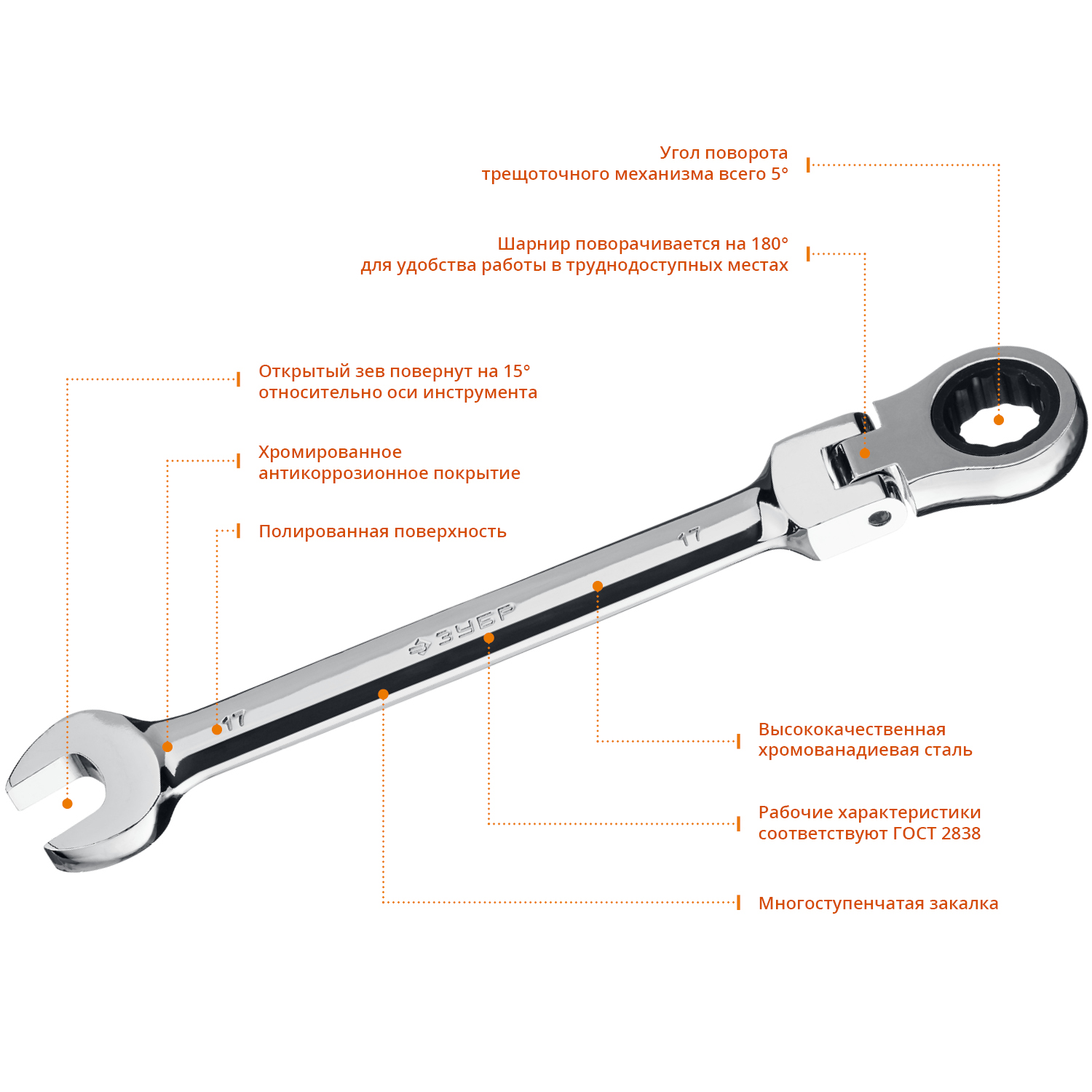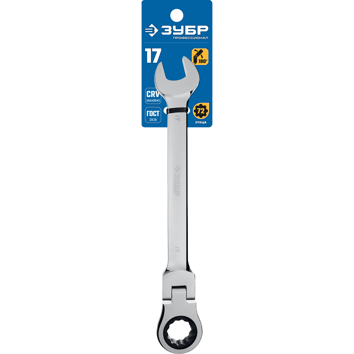 ЗУБР 17 мм, шарнирный трещоточный гаечный ключ, Профессионал (27101-17)