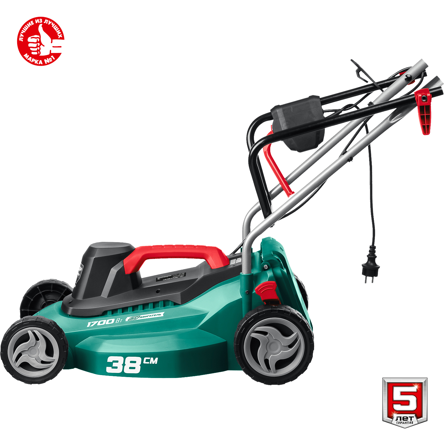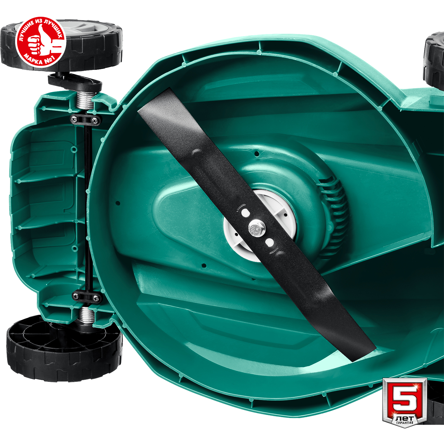 - Облегченные колеса и эргономичная рукоятка облегчают перемещение косилки по газону