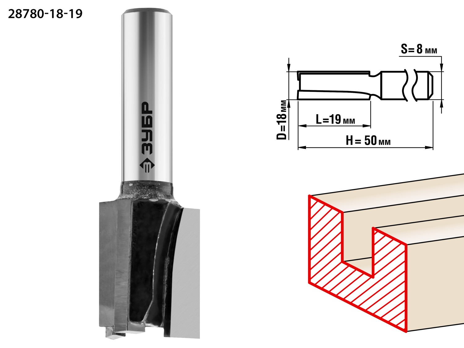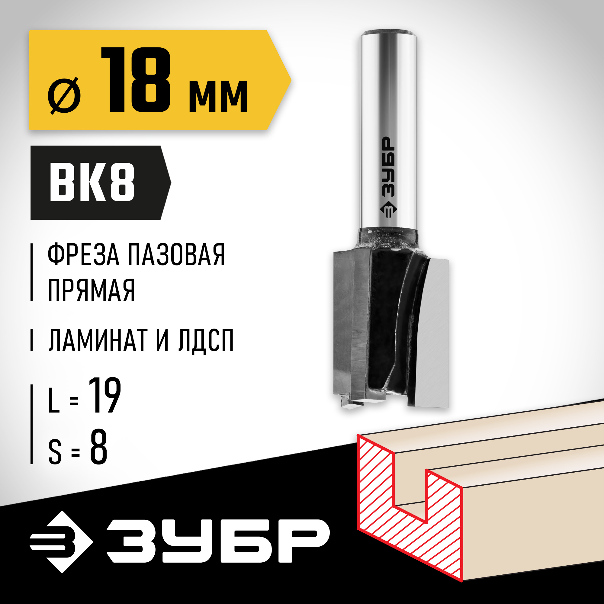 ЗУБР 18 x 19 мм, хвостовик 8 мм, фреза пазовая прямая, Профессионал (28780-18-19)