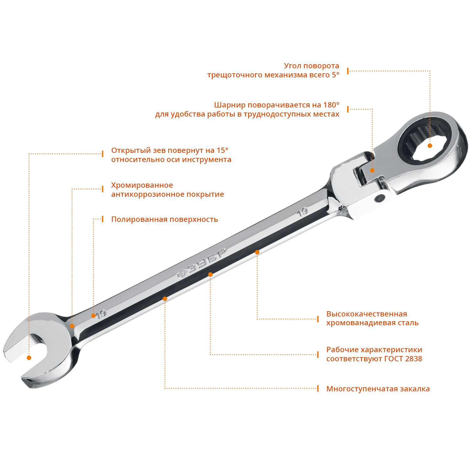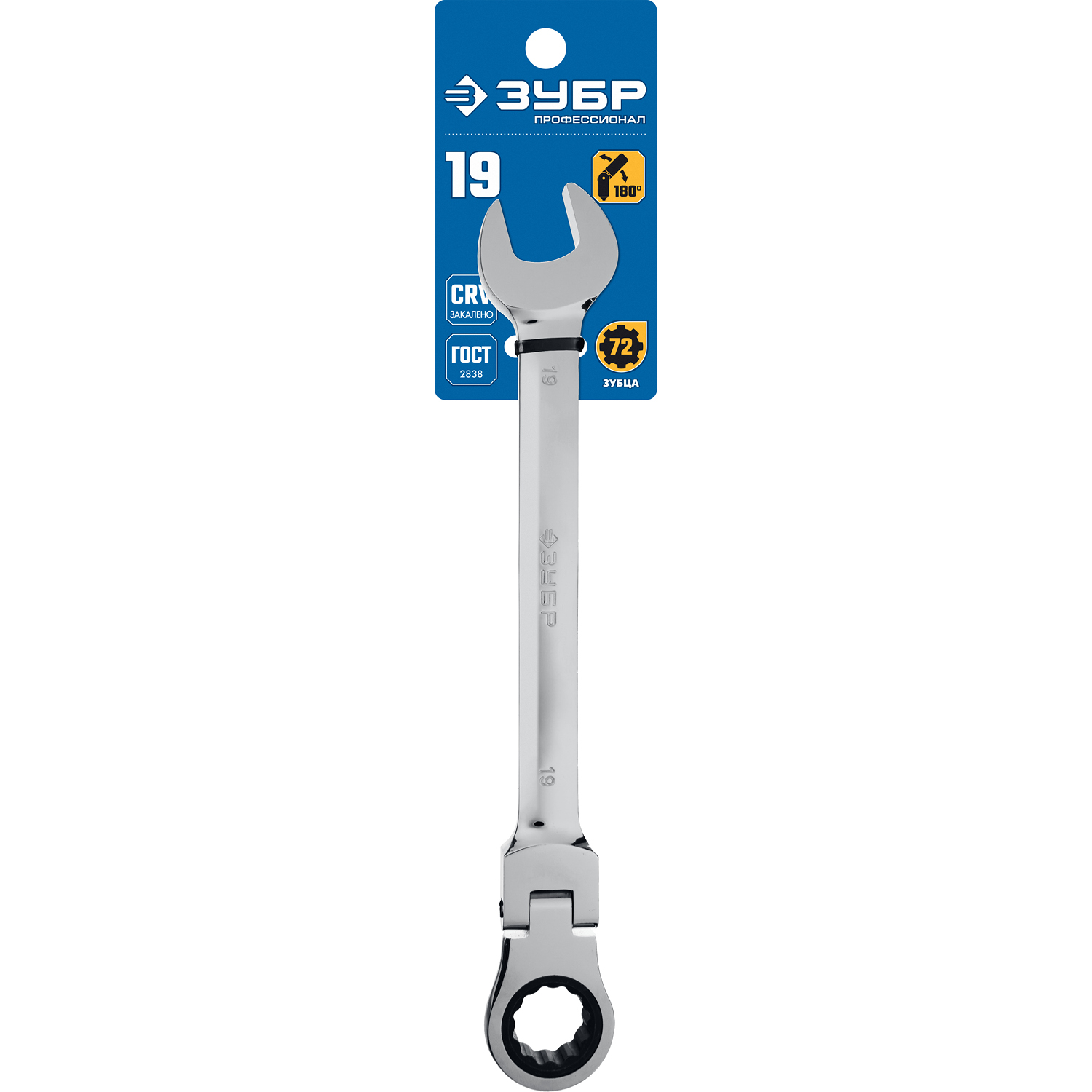 ЗУБР 19 мм, шарнирный трещоточный гаечный ключ, Профессионал (27101-19)