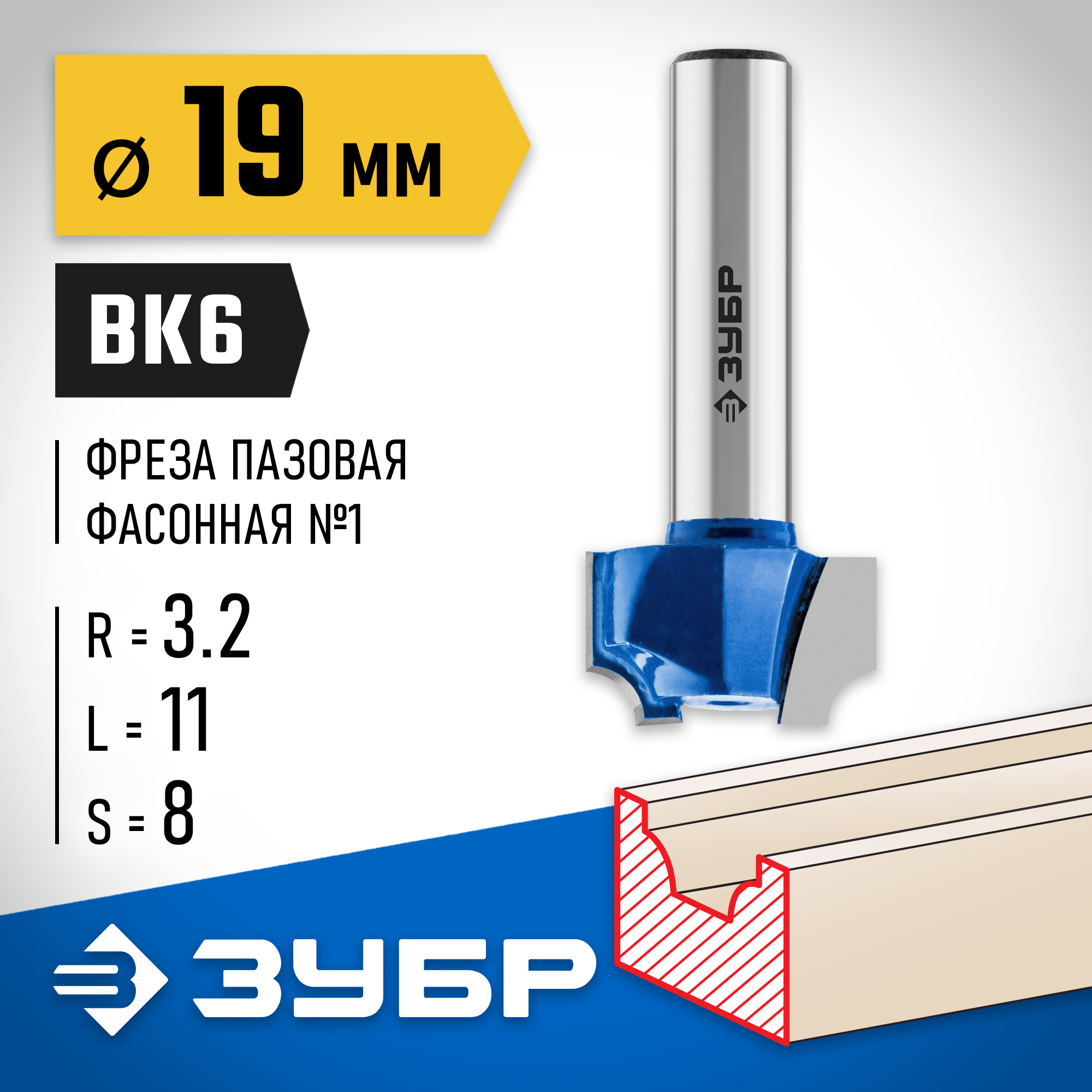 ЗУБР 19 x 11 мм, радиус 3.2 мм, фреза пазовая фасонная №1, Профессионал (28740-19)