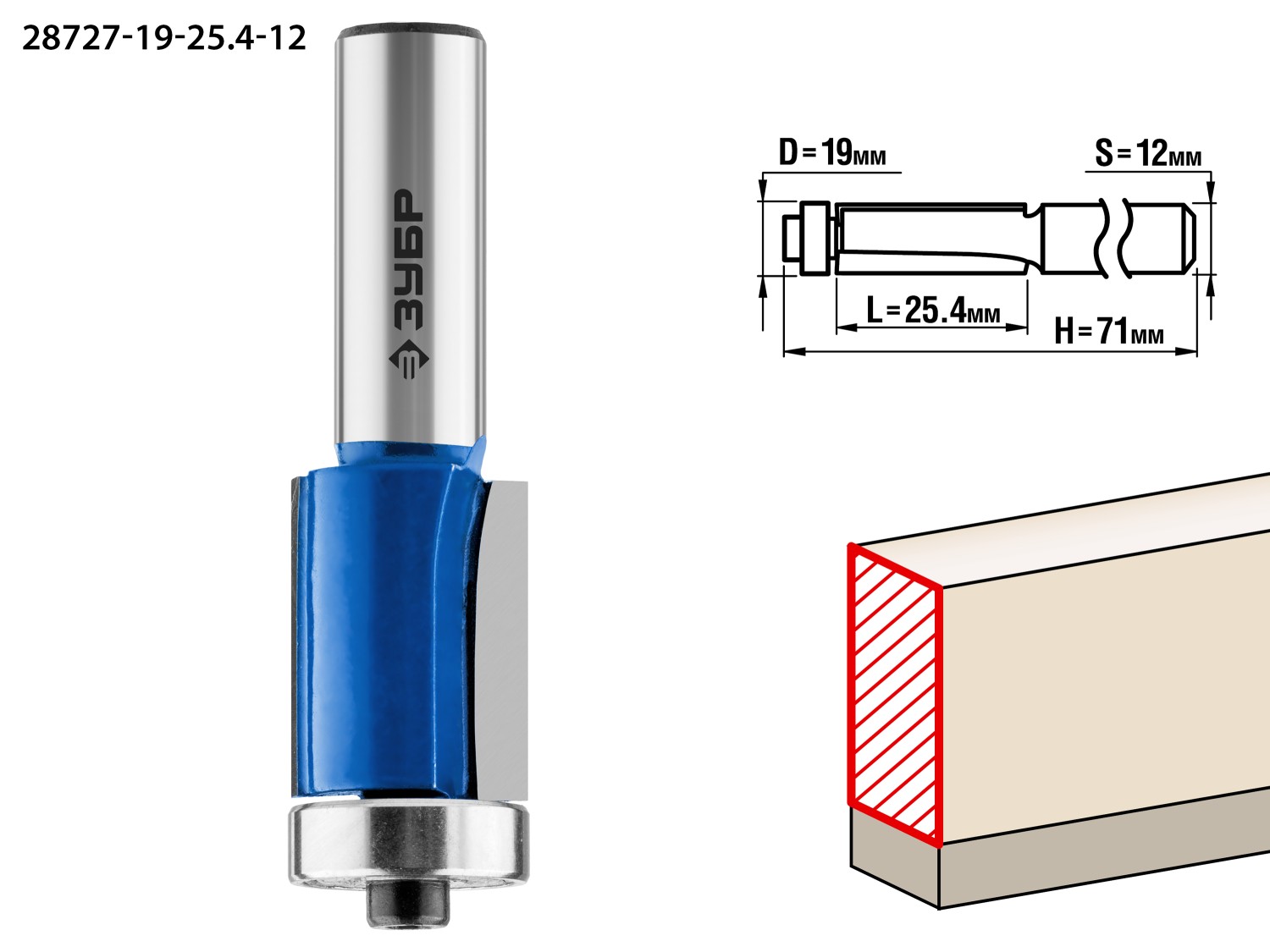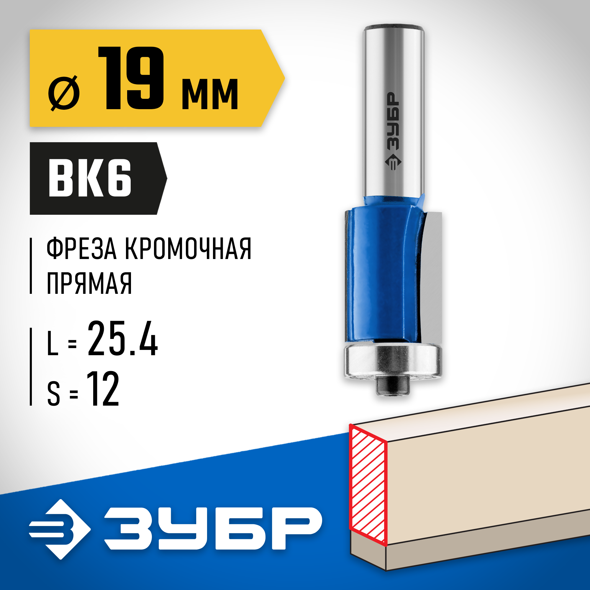 ЗУБР 19 x 25.4 мм, хвостовик 12 мм, фреза кромочная с нижним подшипником, Профессионал (28727-19-25.4-12)