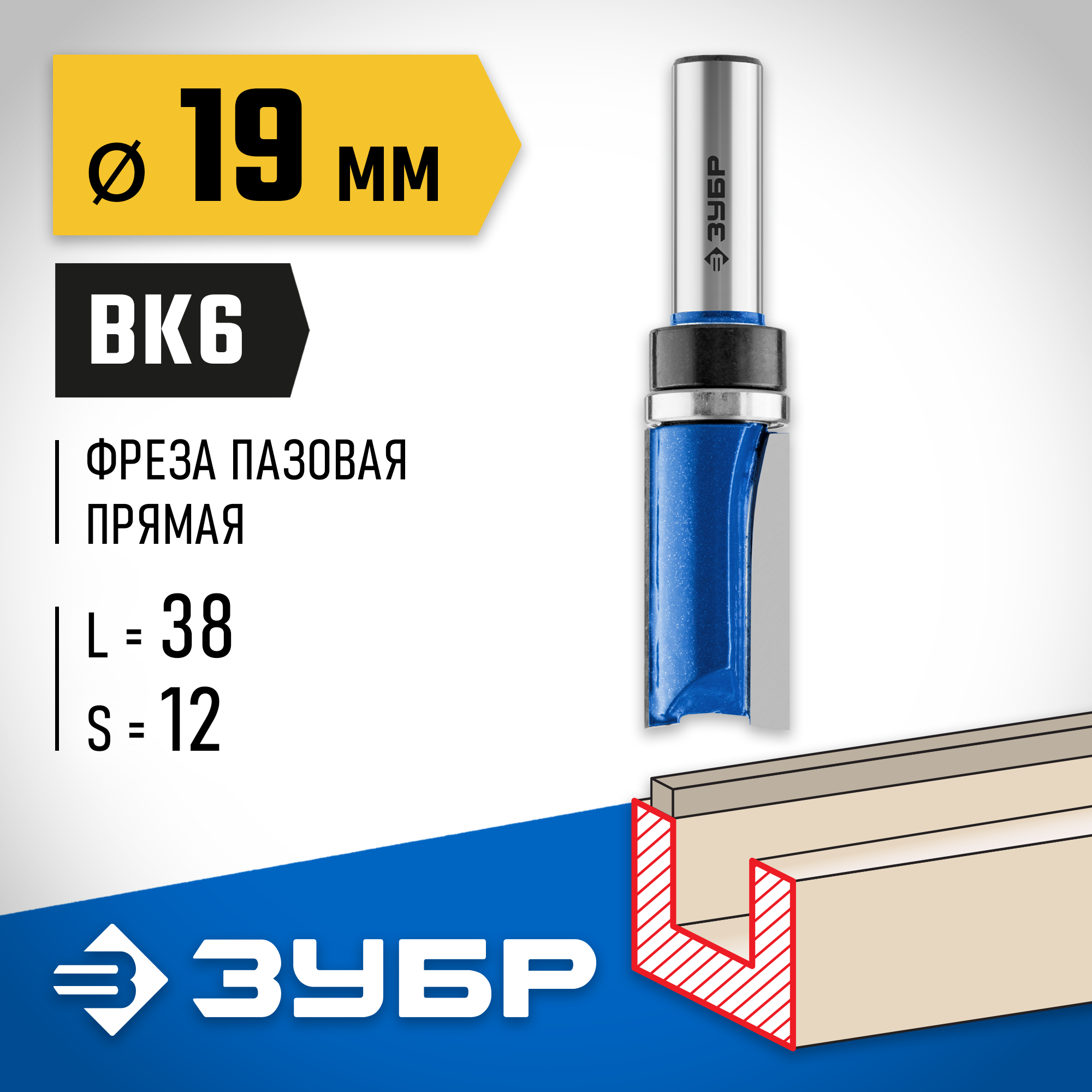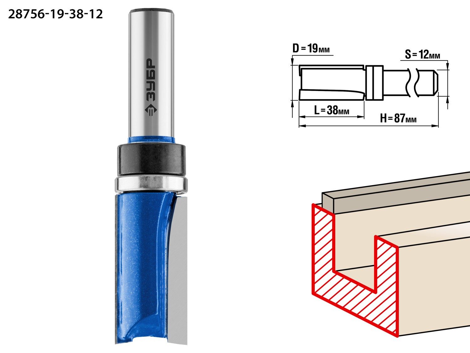 ЗУБР 19 x 38 мм, хвостовик 12 мм, фреза пазовая прямая с верхним подшипником. , Профессионал (28756-19-38-12)