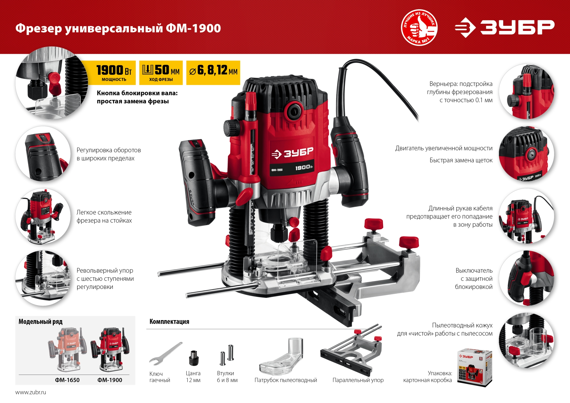 - Рабочий ход фрезы 50 мм и возможность использования полного хода для фрез диаметром до 42 мм