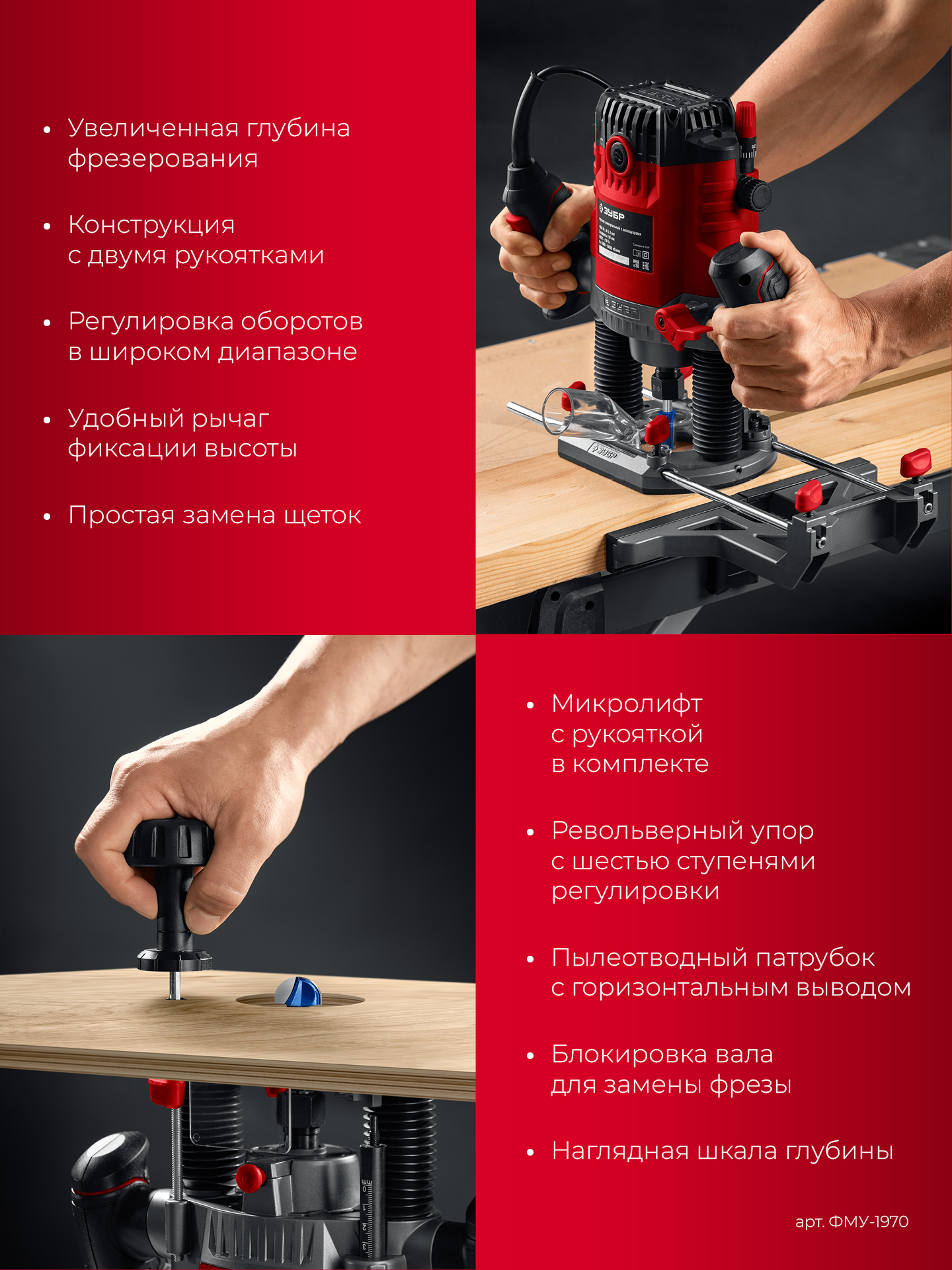 - Функция микролифта с комплектной рукояткой позволяет регулировать вылет фрезы при установке ″в стол″