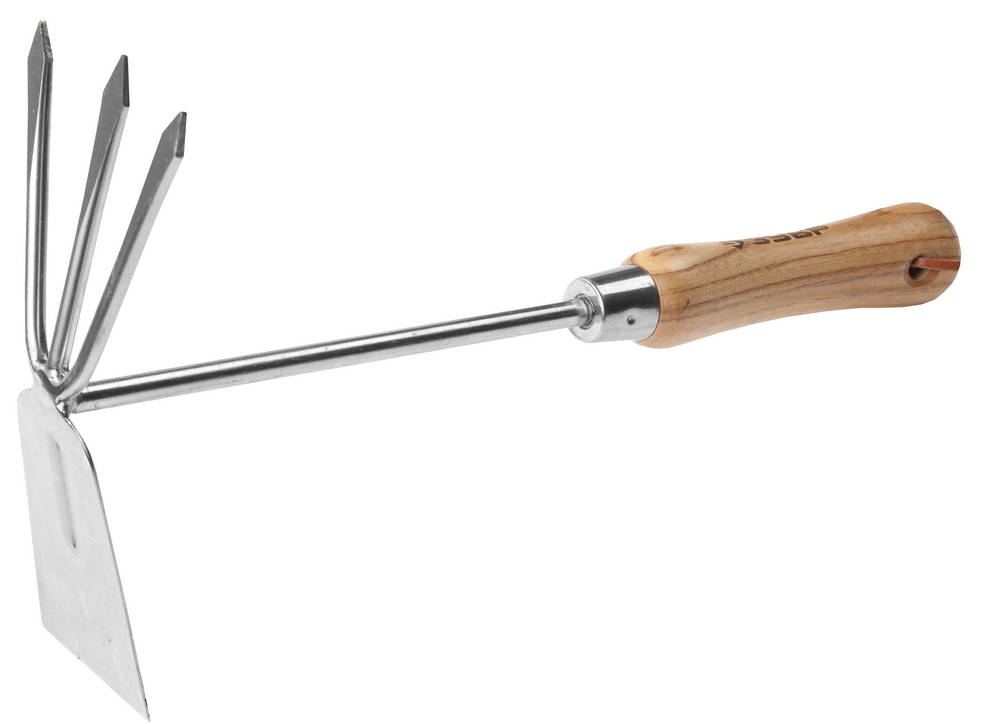Мотыжка комбинированная объединяет в себе 2 инструмента - мотыгу и культиватор. Этот универсальный инструмент применяется для рыхления и аэрирования почвы, прополки растений, сбора мусора. Рабочая часть - двухсторонняя, состоит из грабелек с тремя зубьями и мотыжки. Закалённая нержавеющая сталь и рукоятка из твёрдой древесины высшего сорта гарантируют продолжительный срок службы инструмента. На рукоятке имеется специальная петелька для подвешивания и удобного хранения.