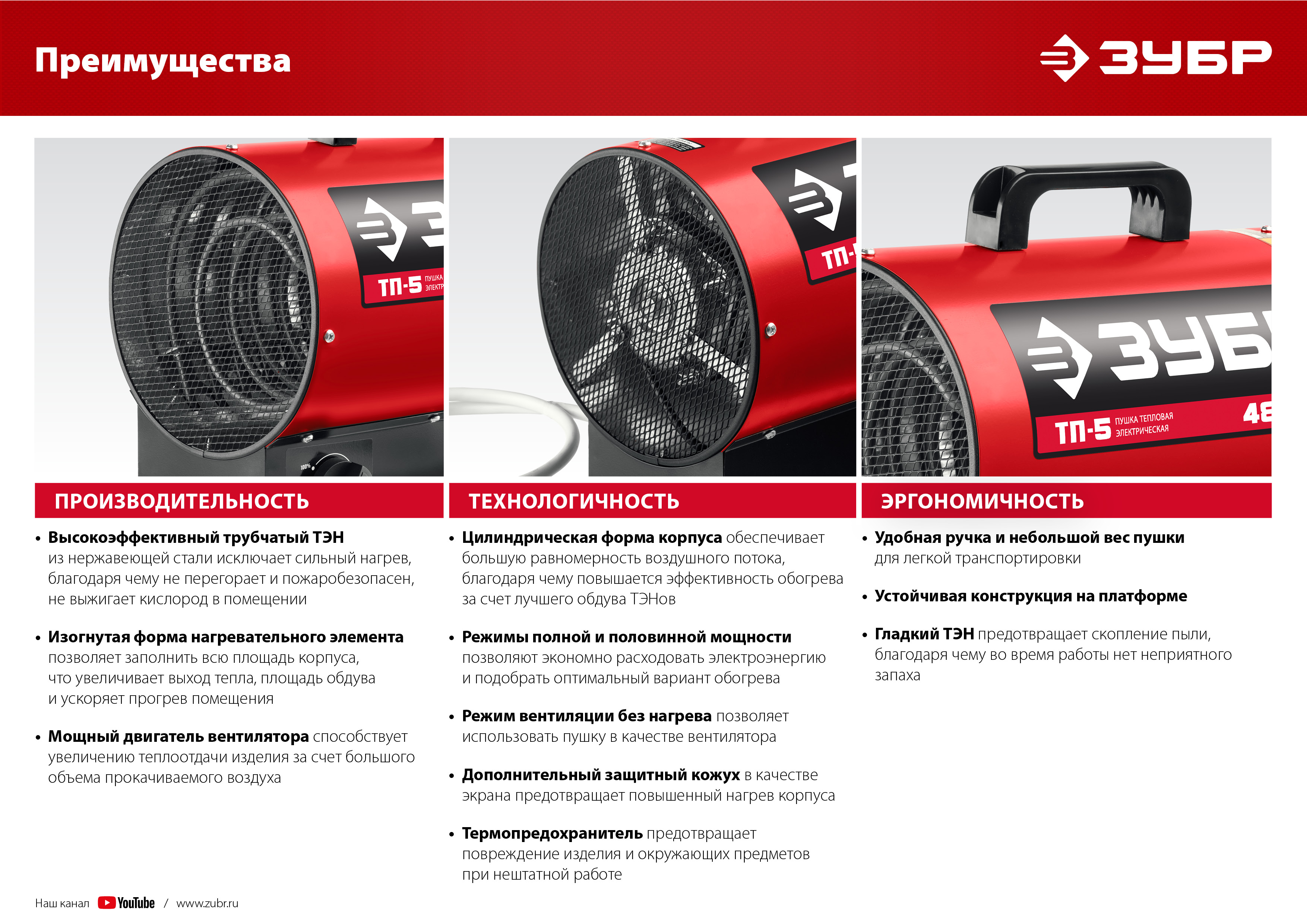 • Цилиндрическая форма корпуса для большей равномерности воздушного потока, благодаря чему повышается эффективность обогрева за счет лучшего обдува ТЭНов