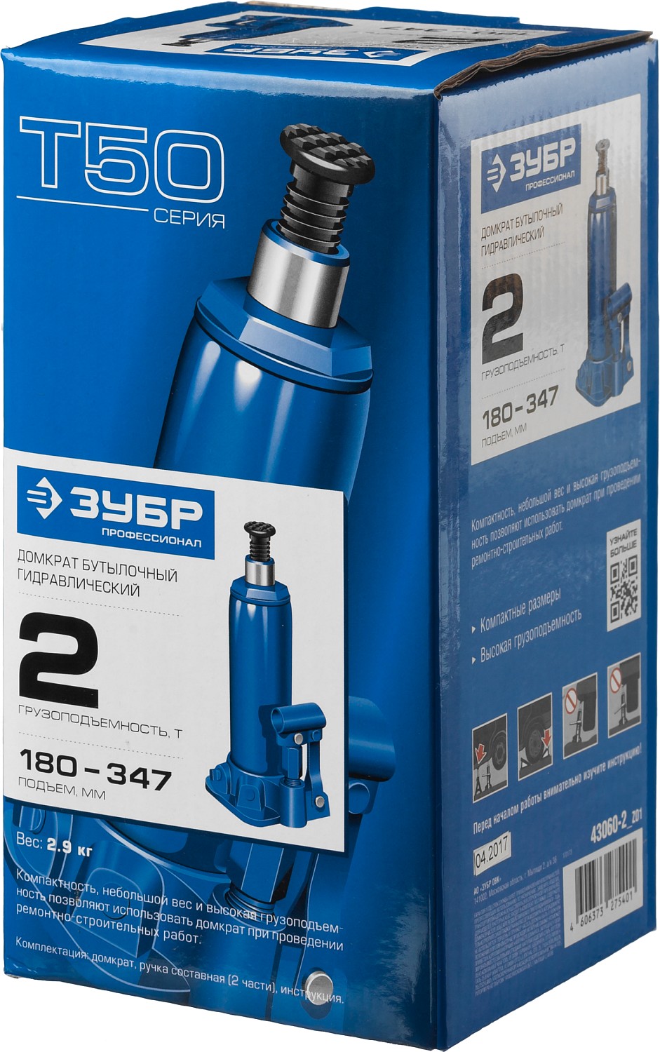 ЗУБР 2 т, 180 - 347 мм, бутылочный гидравлический домкрат, Профессионал (43060-2)