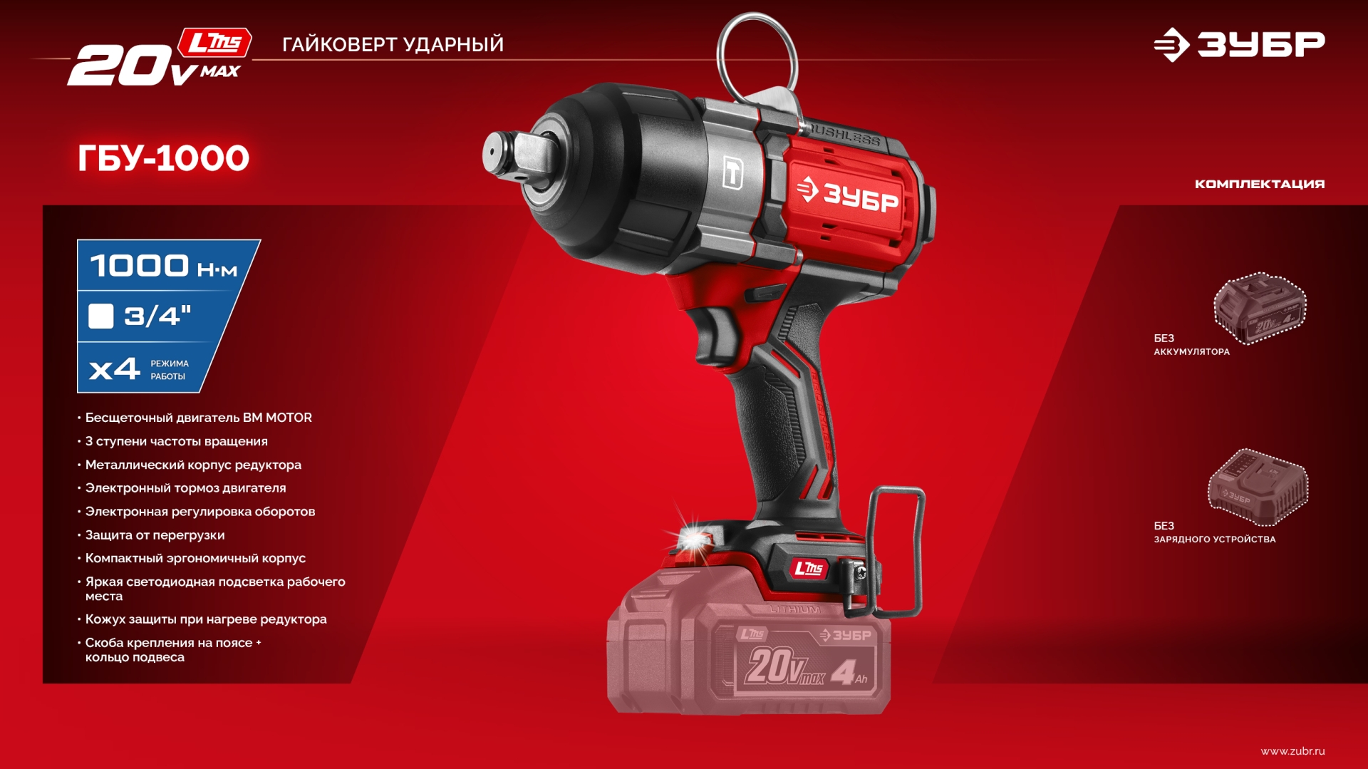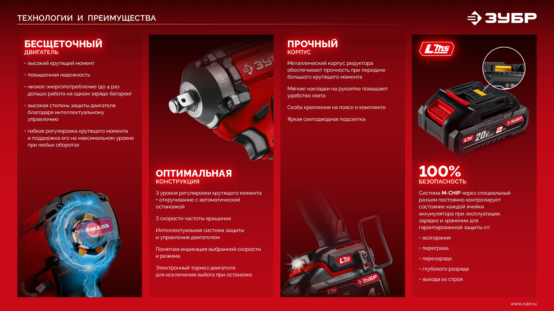 Бесщеточный ударный гайковерт ЗУБР системы LMS с максимальным крутящим моментом 1000 Нм предназначен для фиксации резьбовых соединений размером до М26. Ударная функция с тангенциальным направлением удара обеспечивает эффективное заворачивание без реактивного момента на кисть оператора