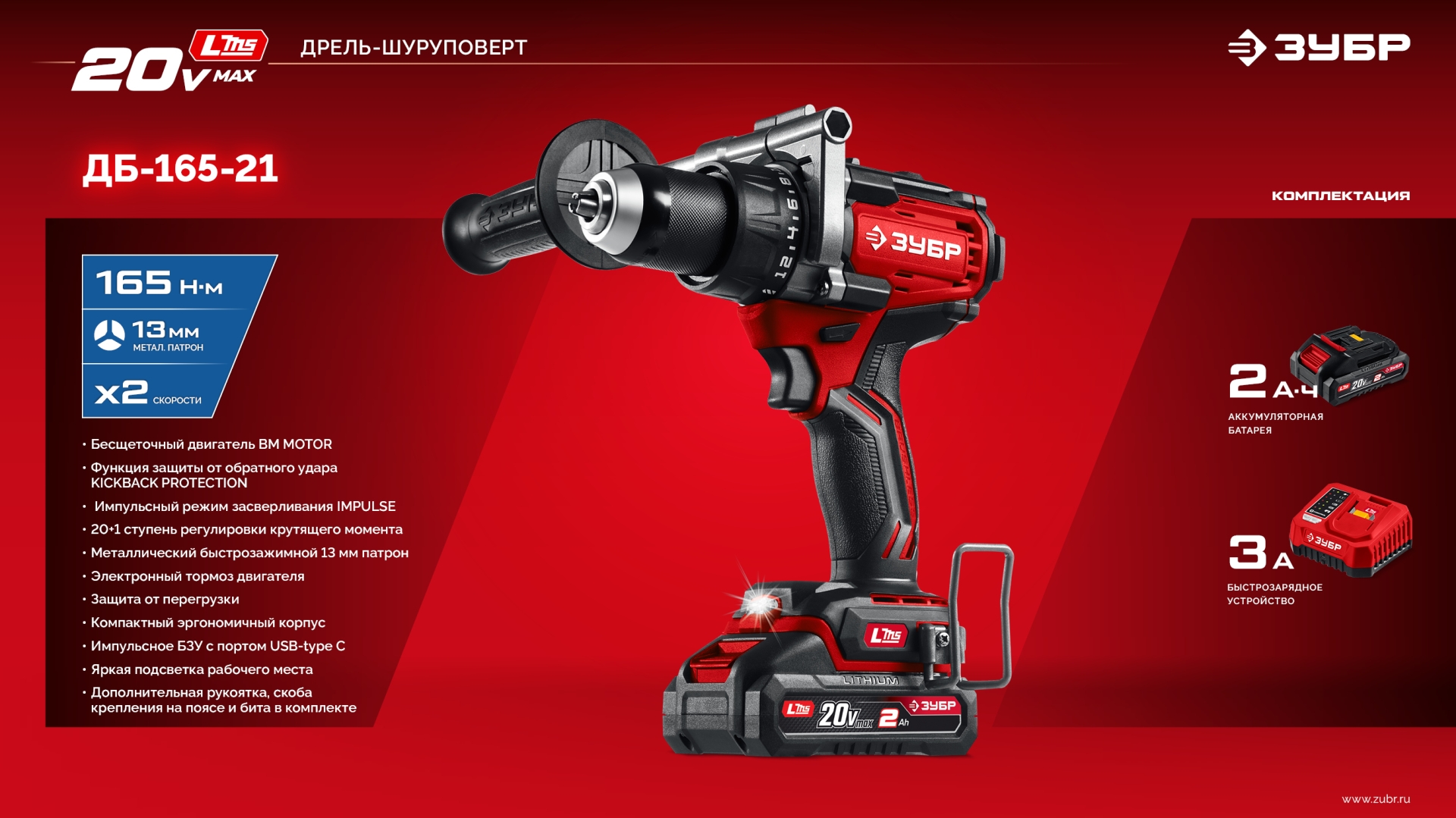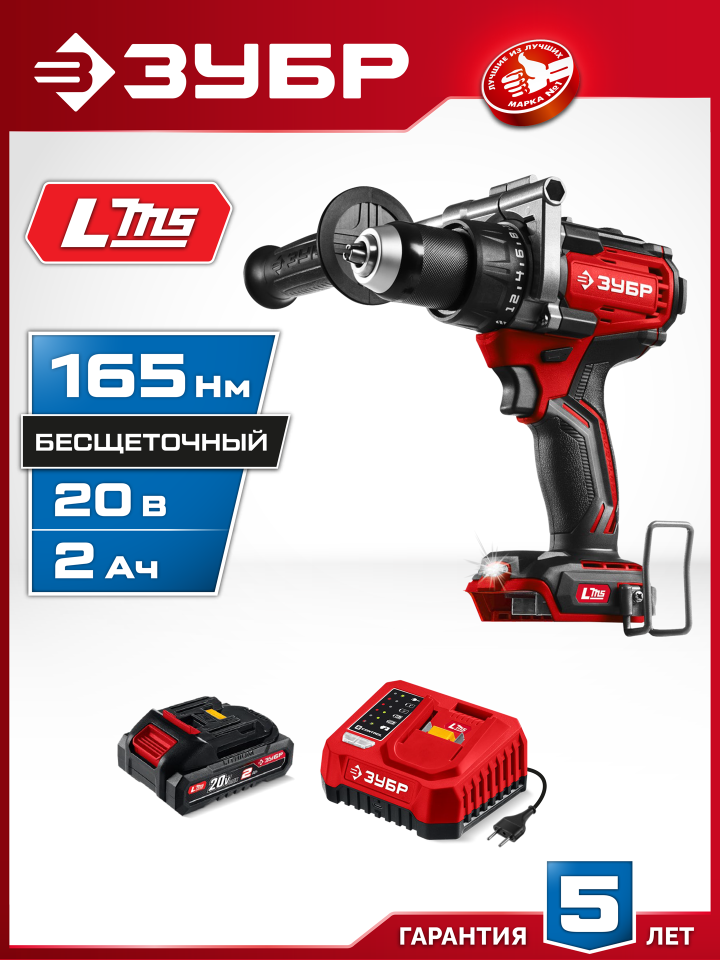 Бесщеточная дрель-шуруповерт ЗУБР системы LMS с максимальным крутящим моментом 165 Нм предназначена для работы с самым крупным крепежом (саморезы до 12 мм диаметром) и сверления отверстий до 40 мм в дереве. Встроенная защита от обратного удара предотвращает повреждение кисти при резкой блокировке вала. Комплектация с аккумулятором позволяет начать работу сразу после покупки