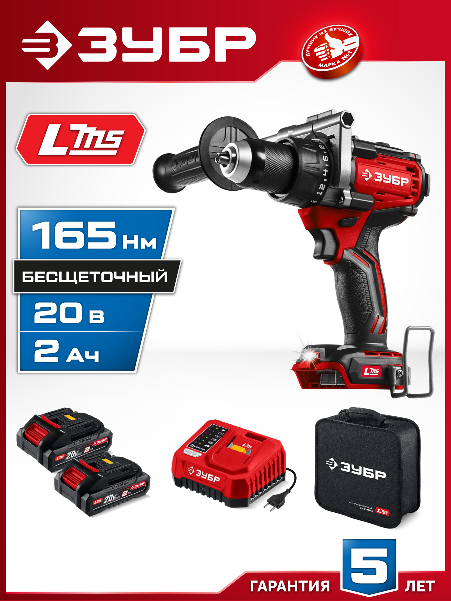 Бесщеточная дрель-шуруповерт ЗУБР системы LMS с максимальным крутящим моментом 165 Нм предназначена для работы с самым крупным крепежом (саморезы до 12 мм диаметром) и сверления отверстий до 40 мм в дереве. Встроенная защита от обратного удара предотвращает повреждение кисти при резкой блокировке вала. Комплектация с двумя аккумуляторами позволяет работать практически без остановки