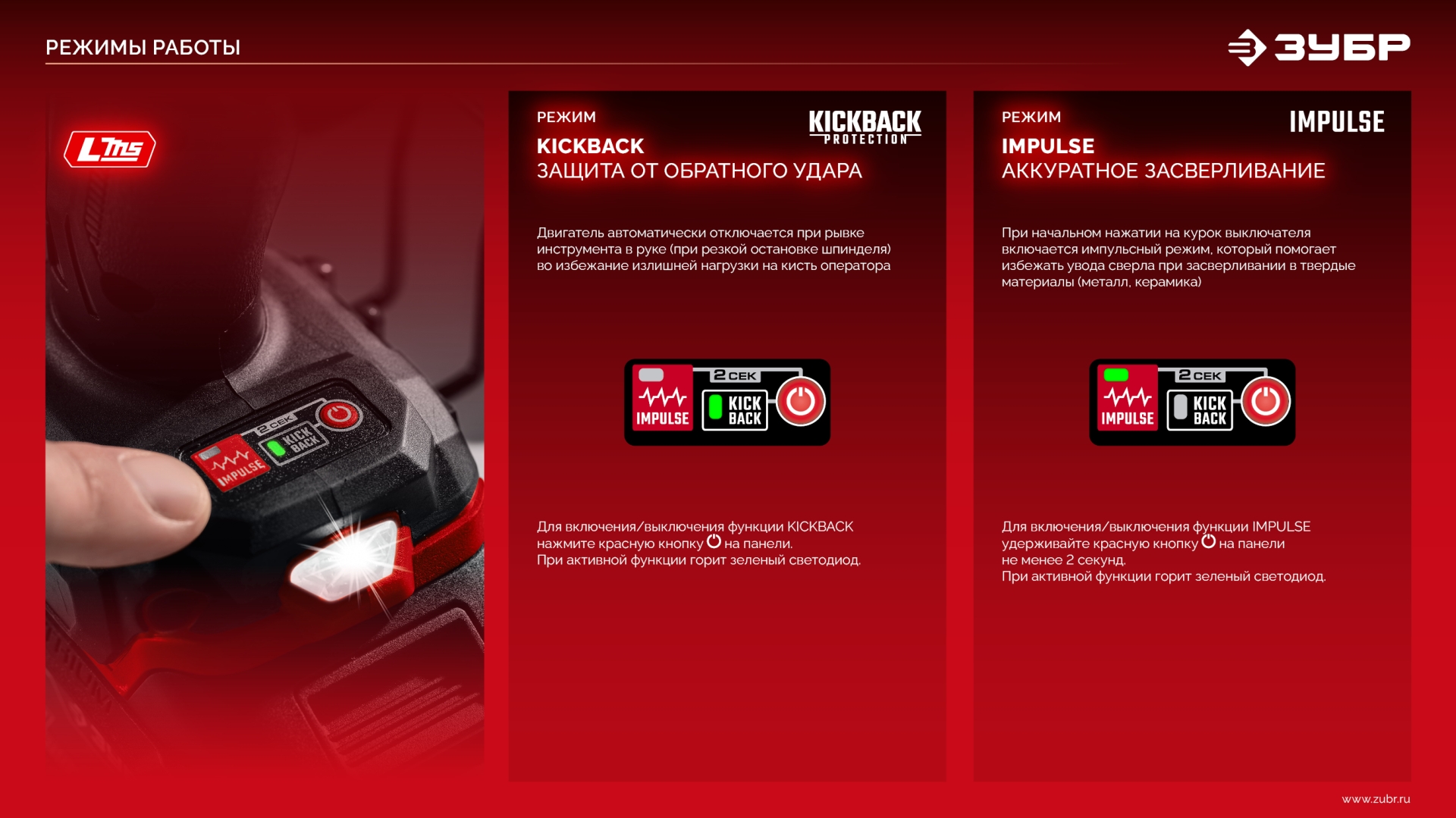 - Встроенная отключаемая защита от обратного удара контролирует рывки инструмента и выключает двигатель, предотвращая травмы оператора